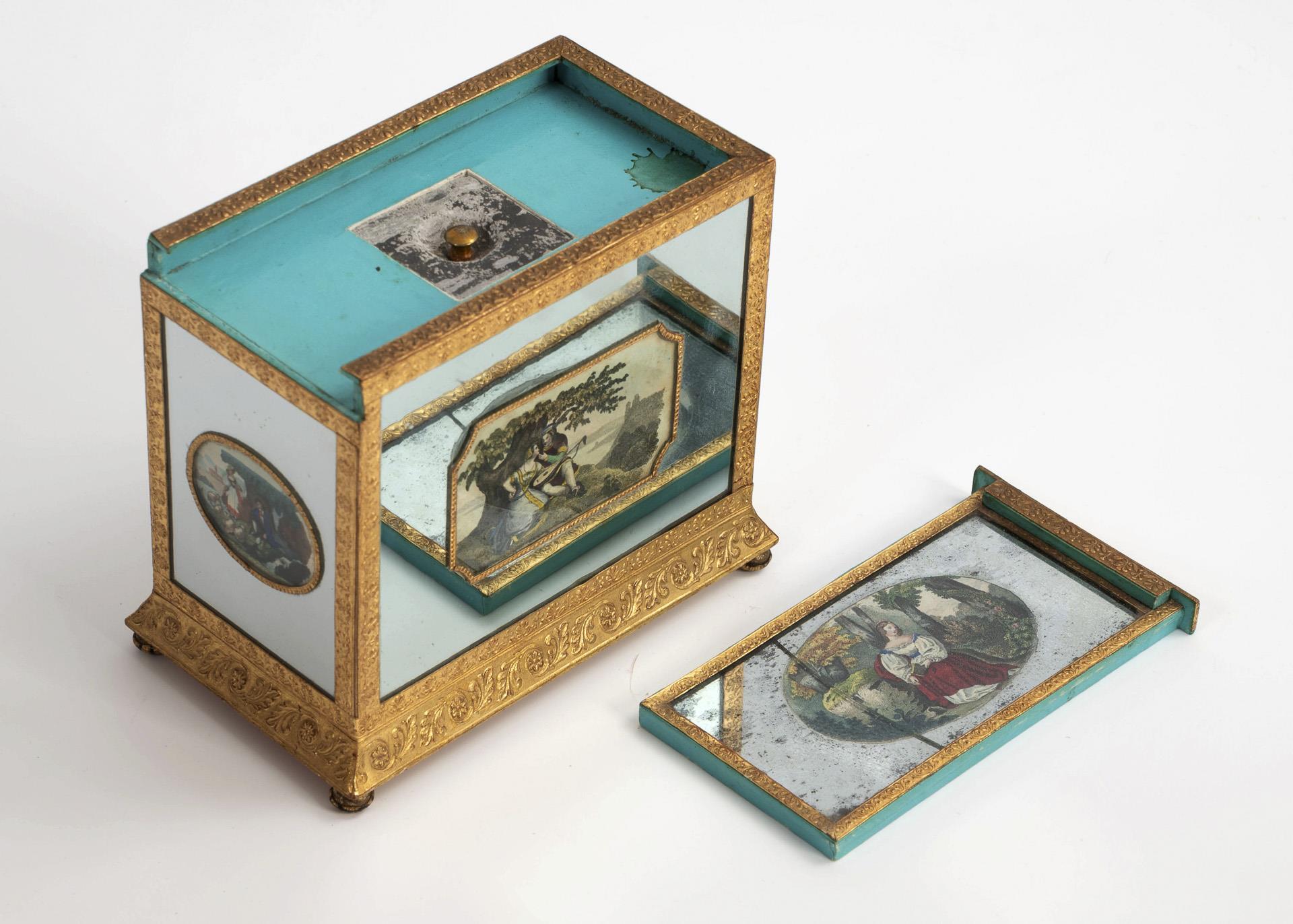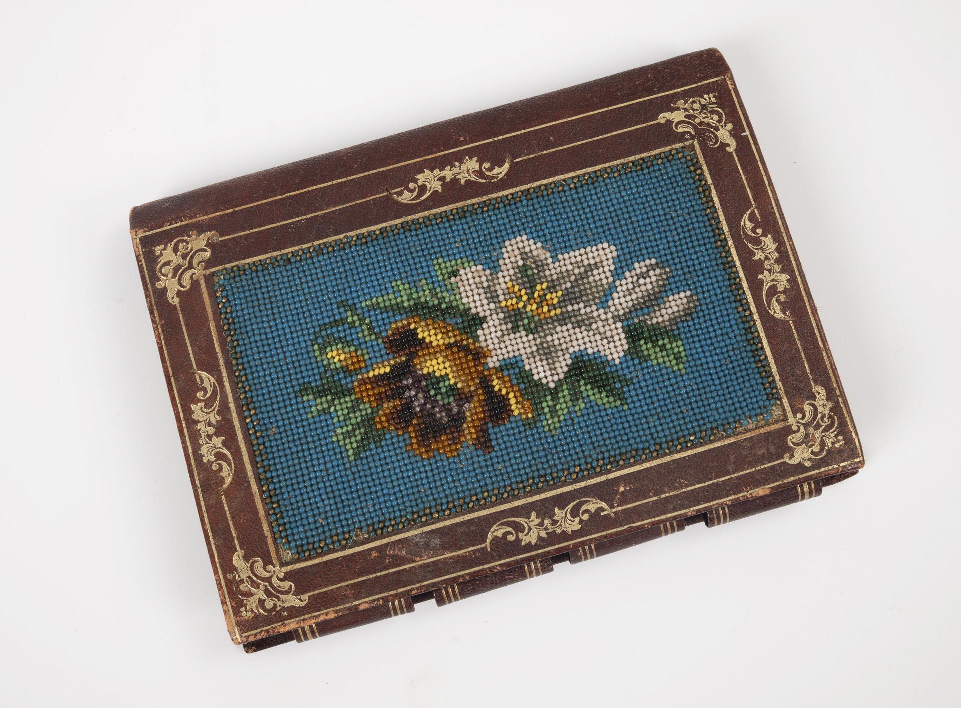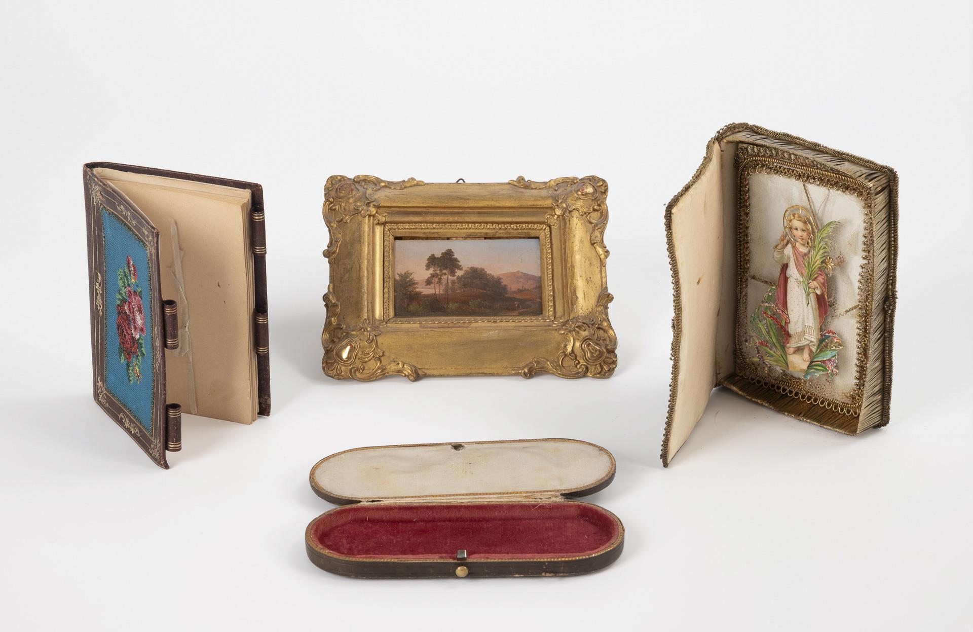 Quaderförmige Teedose, allseits und auf dem Schiebedeckel verspiegelt, mit eingelassenen, teils kolorierten Lithografien (meist Liebespaare) sowie Kantenbeklebungen mit geprägtem Goldpapier. Unter dem Schubdeckel (ergänzter?) Bleideckel für die Zinkdose im Inneren. / Romantische Landschaftsminiatur (Öl/Holz), verso "JAB 1849" bezeichnet; ergänzter Goldstuckrahmen. / Taufbrief-Schatulle mit Klosterarbeit und verglastem Kreuz-Anker-Blumen-Bild (Seide und Luxuspapier). Binnendeckel mit Klosterarbeit und Luxuspapier: Jesuskind). / Braunes Lederetui mit Ornamentstickerei auf dem Scharnierdeckel; innen Samt und Seide. / Unbeschriebenes Notizbuch aus braunem Leder mit Goldprägung; auf beiden Deckeln florale Glasperlenstickerei. 1 Spiegelglas gesprungen, Notizbuch ohne Stift, ohne Taufbrief, Gemälde minimale, sonst einige Alters-/Gebrauchsspuren.