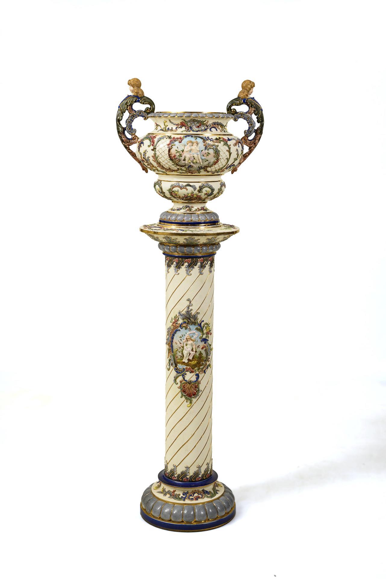Bauchiger Cachepot mit mehrfach geschnürter, reliefierter Wandung und 2 hoch angesetzten Henkeln mit weiblichen Köpfen. Reicher historistischer Dekor mit Puttenreliefs, Rocaillen, Blatt- und Gitterwerk. Dazu passende Rundsäule. Leichte Alters- und Gebrauchsspuren, goldberieben, Bestoßungen.