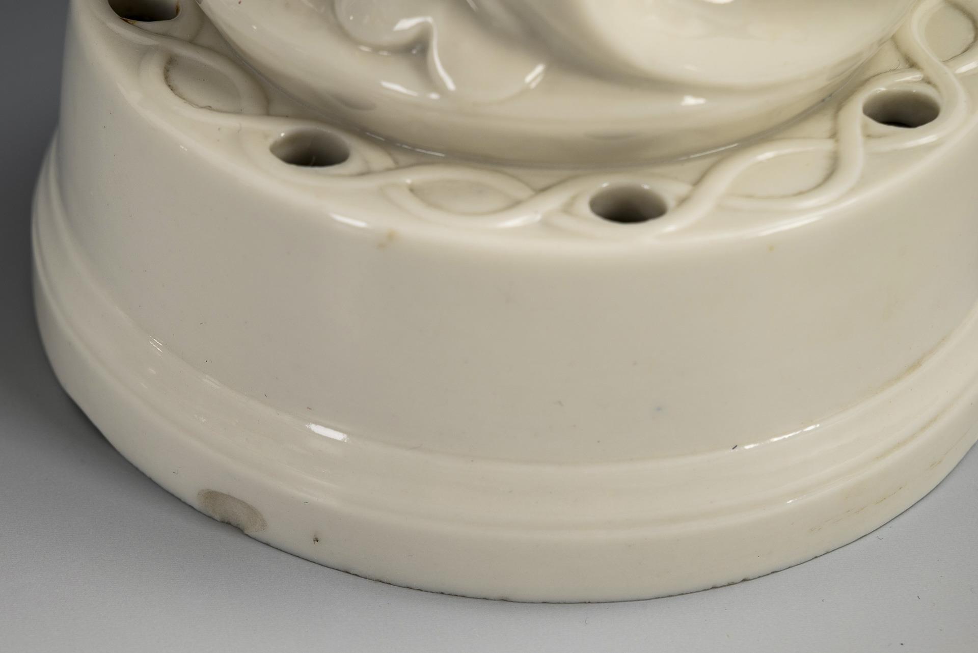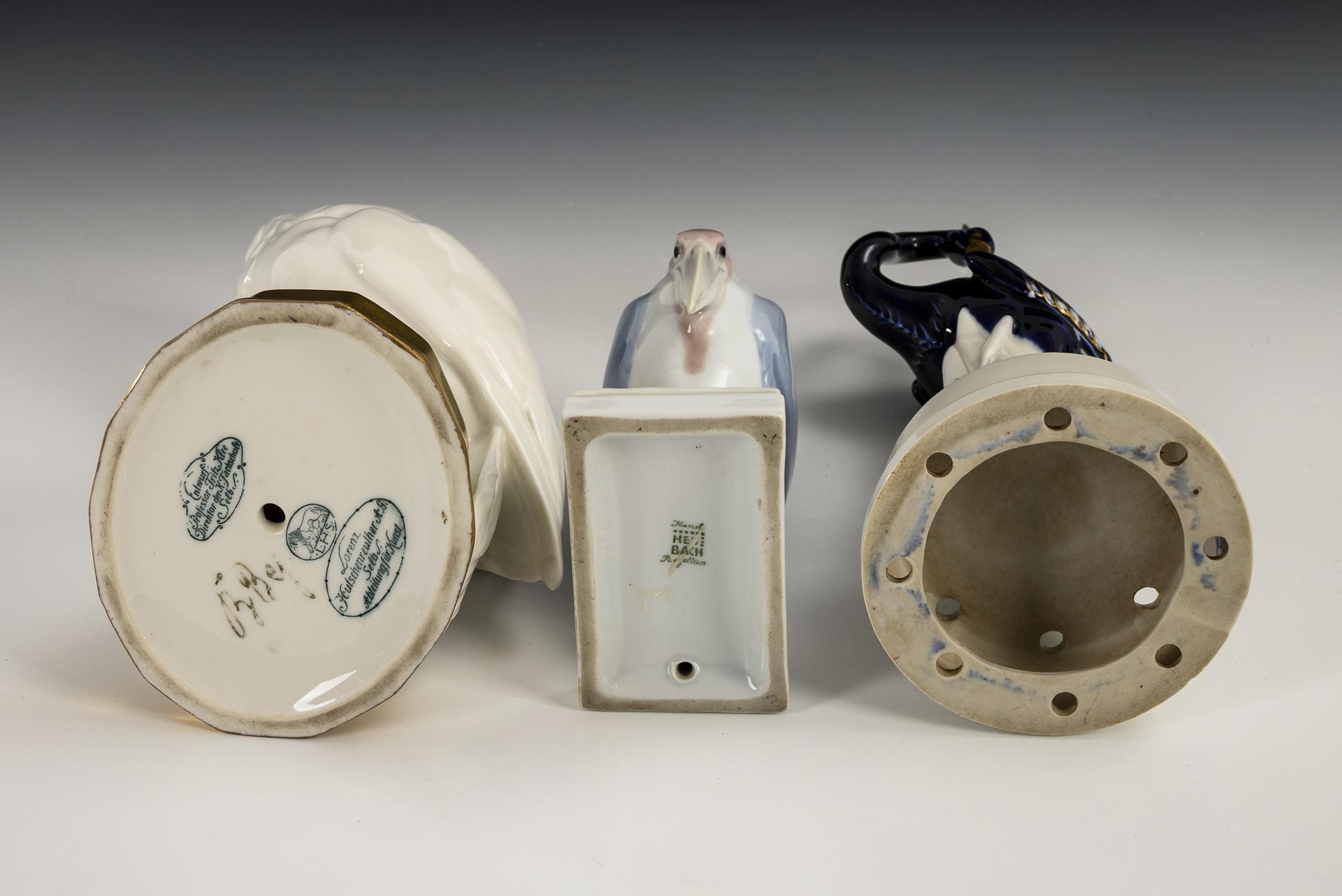 1x HUTSCHENREUTHER, um 1930: auf einem Sockel mit Mistelrelief sitzendes Käuzchen (H 18,5 cm). / 1x AELTESTE VOLKSTEDTER, ungemarkt, um 1930, Entwurf von Hugo Meisel (1887-1966): Steckschalen-Reiherplastik (H 22 cm). / 1x HEUBACH, um 1910, 1 Schleifstrich: sitzender Marabu (H 14 cm).