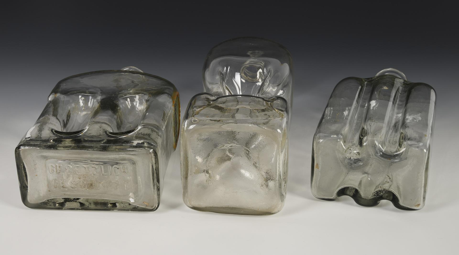 2 Vierkantflaschen mit Greifrillen und 1 quadratische Flasche mit eingezogenen Seiten, 1x mit originaler Emailbeschriftung "Himbeer".