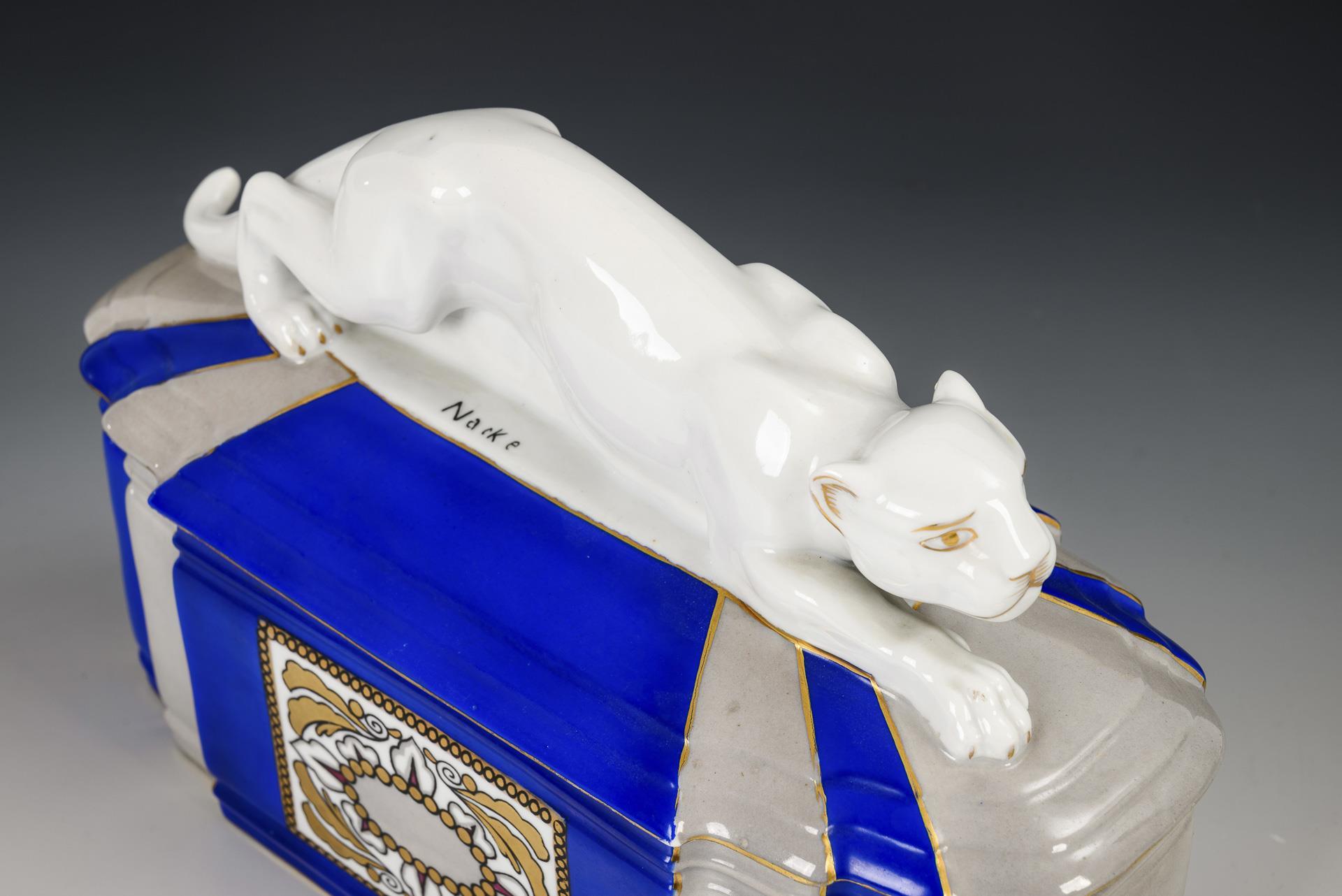 Ovale Dose mit der plastischen Figur eines schleichenden Panthers auf dem Deckel. Graue und blaue, streifig angeordnete Fondflächen, auf dem Korpus beidseitig eine Rechteckkartusche mit einem stilisiert vegetabilen Muster. Unterseitiger kleiner Chip am Deckelrand, Wandungshaarriss.