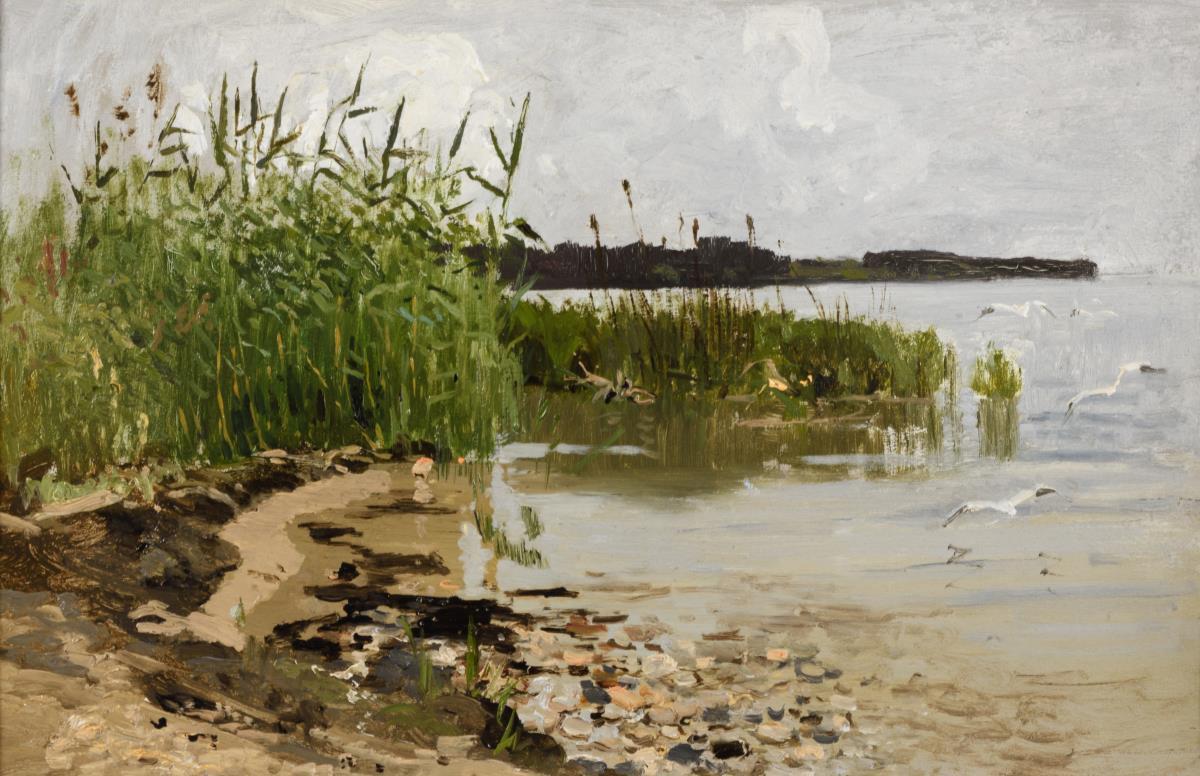 Verschilftes Ufer mit einigen Vögeln bei klarem Licht.