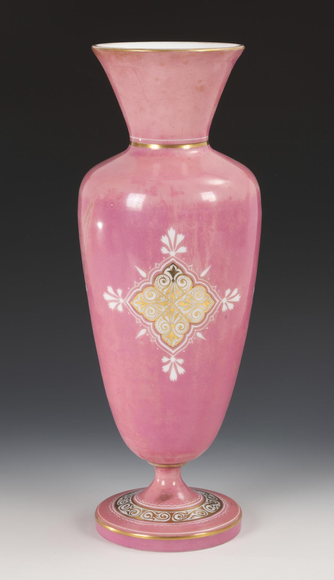 Weißes Milchglas, polychromes Dekor, Goldstaffage. H 46 cm.