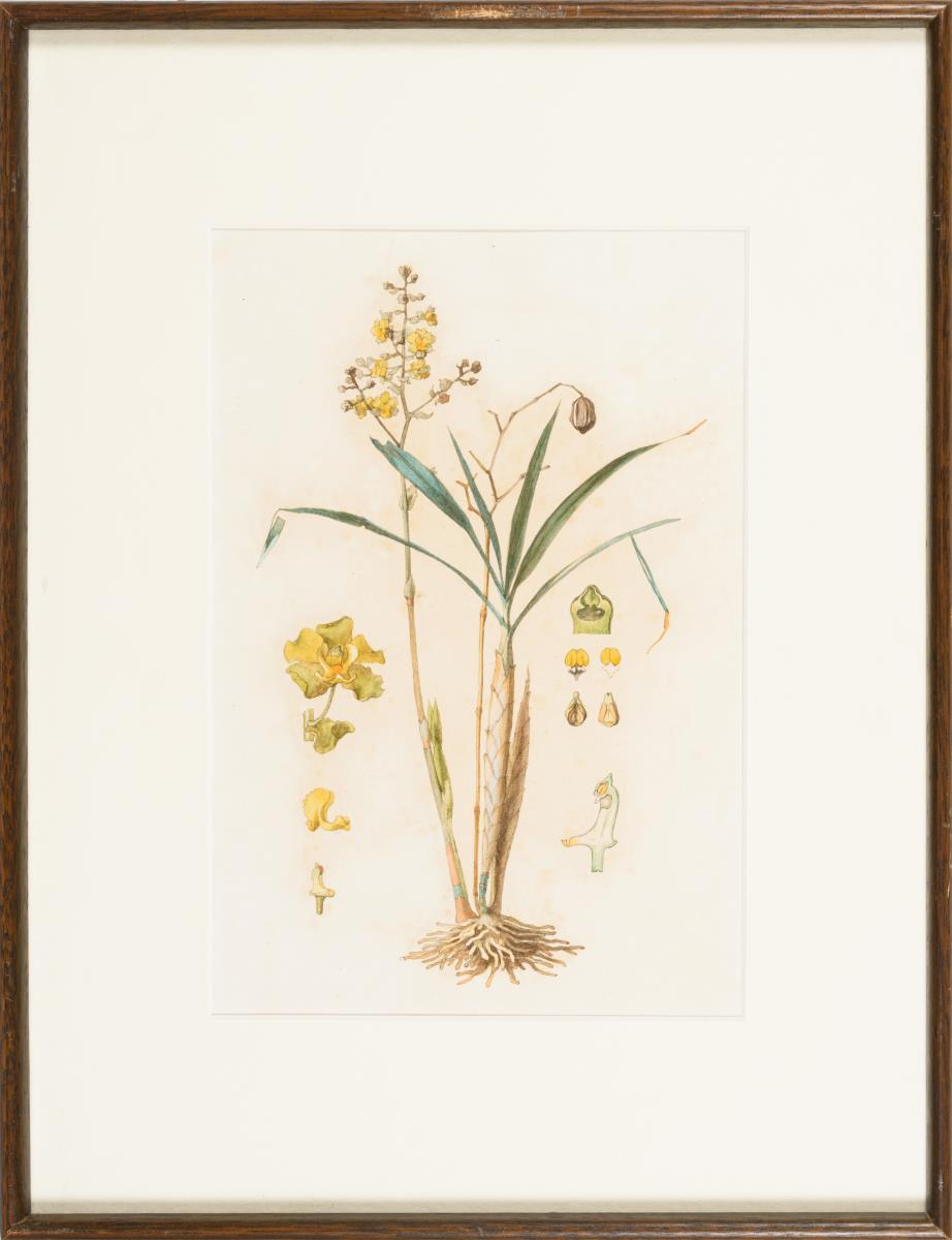 Sehr detailliert wiedergegebene Pflanze mit gelben Blüten. Papier leicht gebräunt.