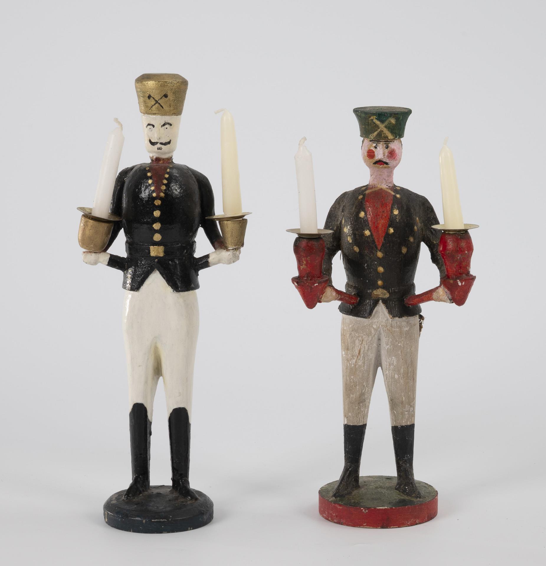 2 Leuchter-Bergmänner mit Brotteigarmen. Altersspuren, kleine Defekte, teils farblich nachgefasst.