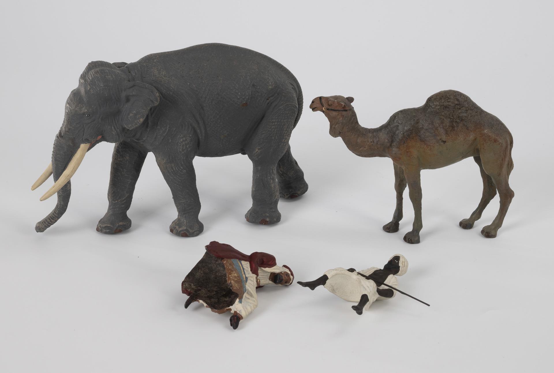 Dromedar mit abnehmbarem Beduinenreiter, H 14 cm. / Elefant und abnehmbarer Elefantenführer mit Turban, H 19 cm. Elefant mit minimalen Trockenrissen.