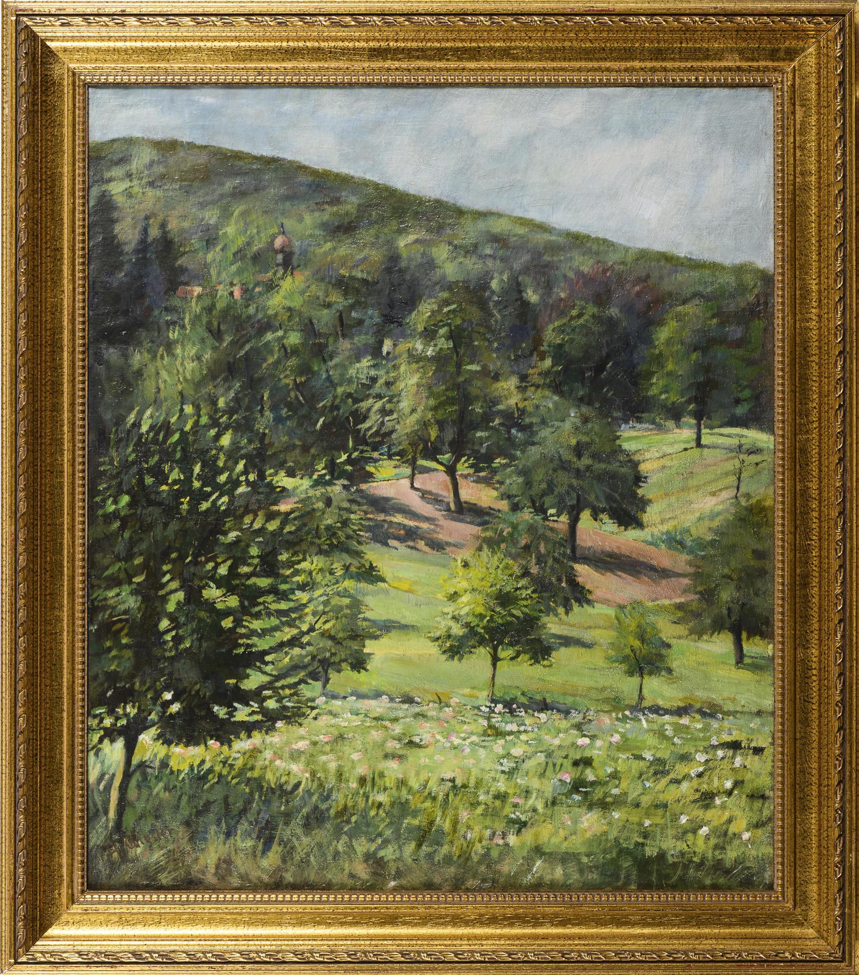 Sommerliche Landschaft mit dichtem Wald an einem Berg und dazwischen hervorschauendem Kirchturm.