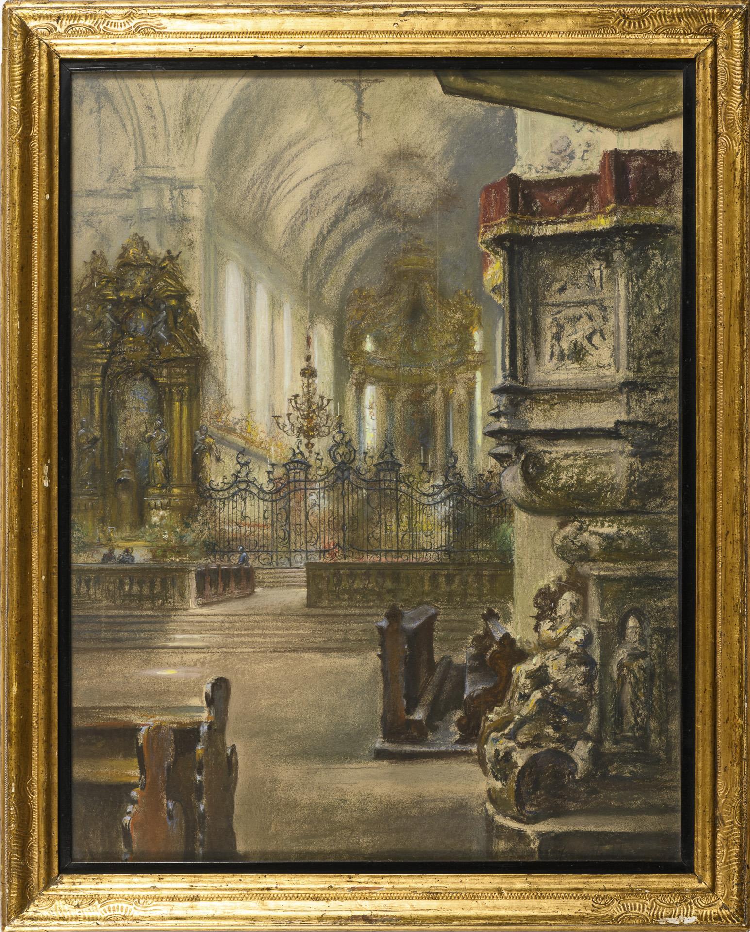 Blick von den Bänken zum Altar in der barocken Kirche | Nachtrag 01.10.2025: Innenansicht des Würzburger Doms.