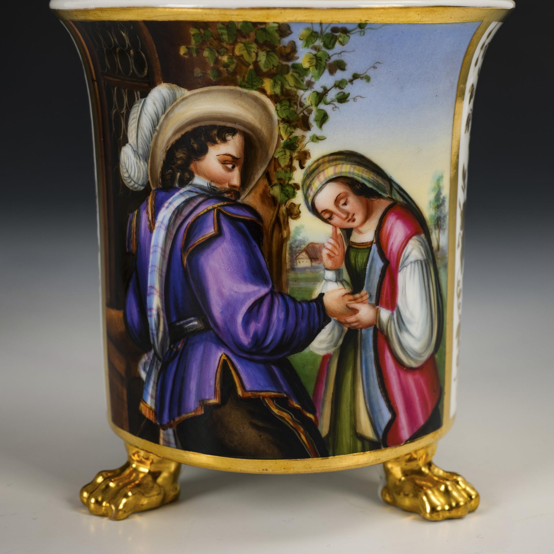 Zylindertasse mit Kraterrand, Rosettenhenkel und drei Tatzenfüßen. Schauseitig eine goldgerahmte Rechteckkartusche mit der Darstellung eines jungen Mannes, dem eine junge Frau in der Hand liest, verso vegetabile Goldmalerei.