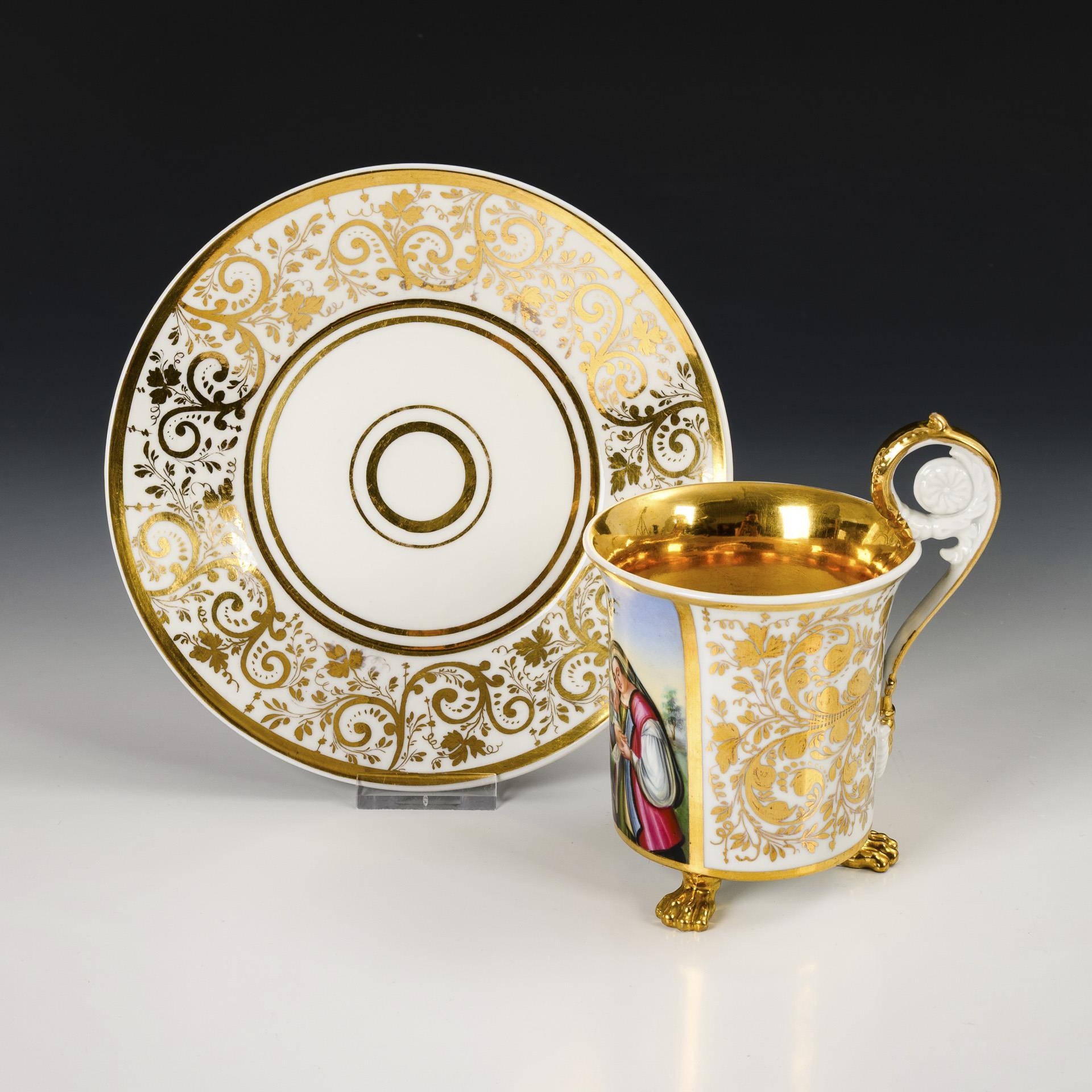 Polychrom bemalt, goldstaffiert. Tasse (H 13 cm), originale Untertasse (Ø 18,5 cm).