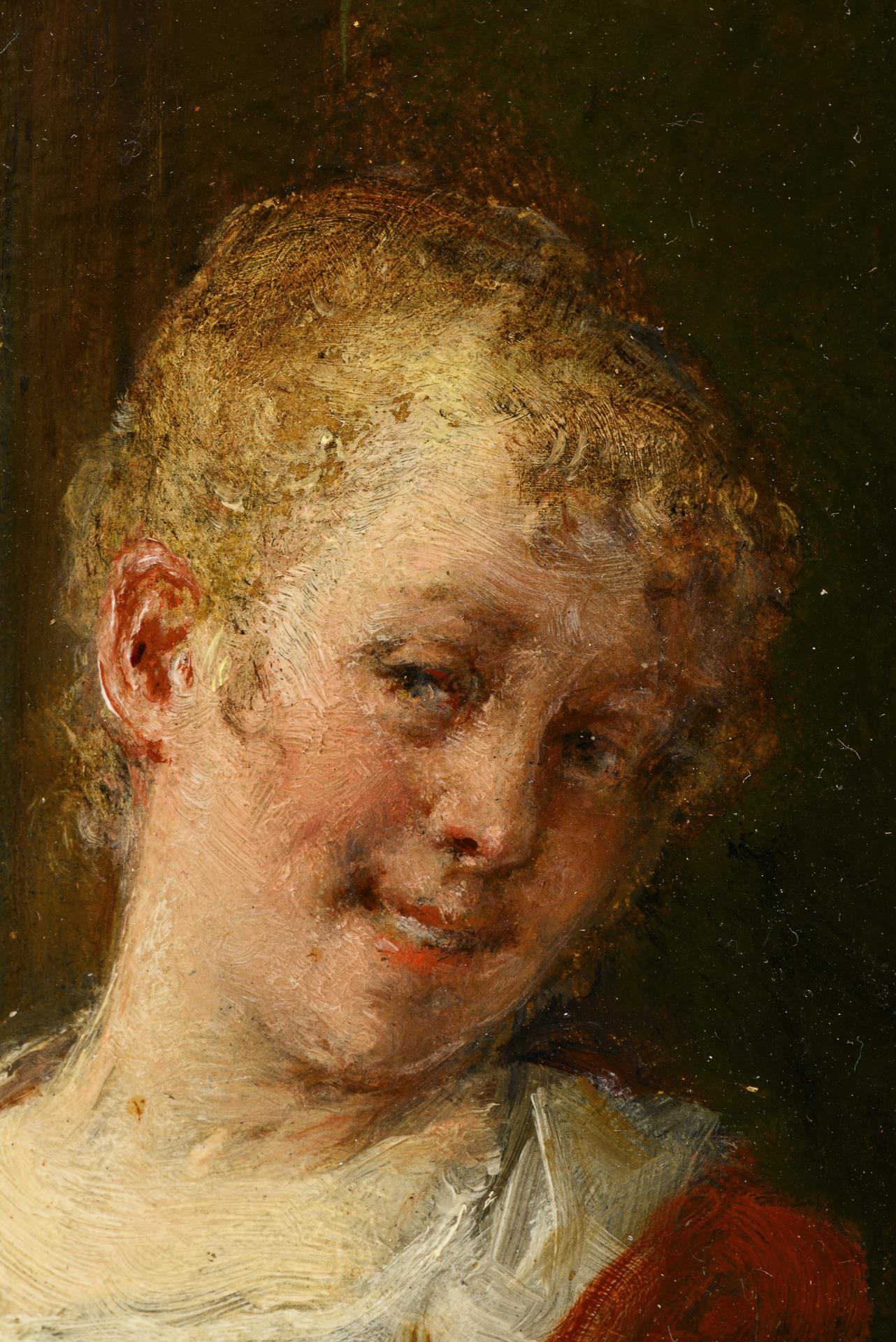 Edelmann in der Kleidung des 17. Jh. beim Flirten mit einer jungen Magd am Fenster. Altersspuren.