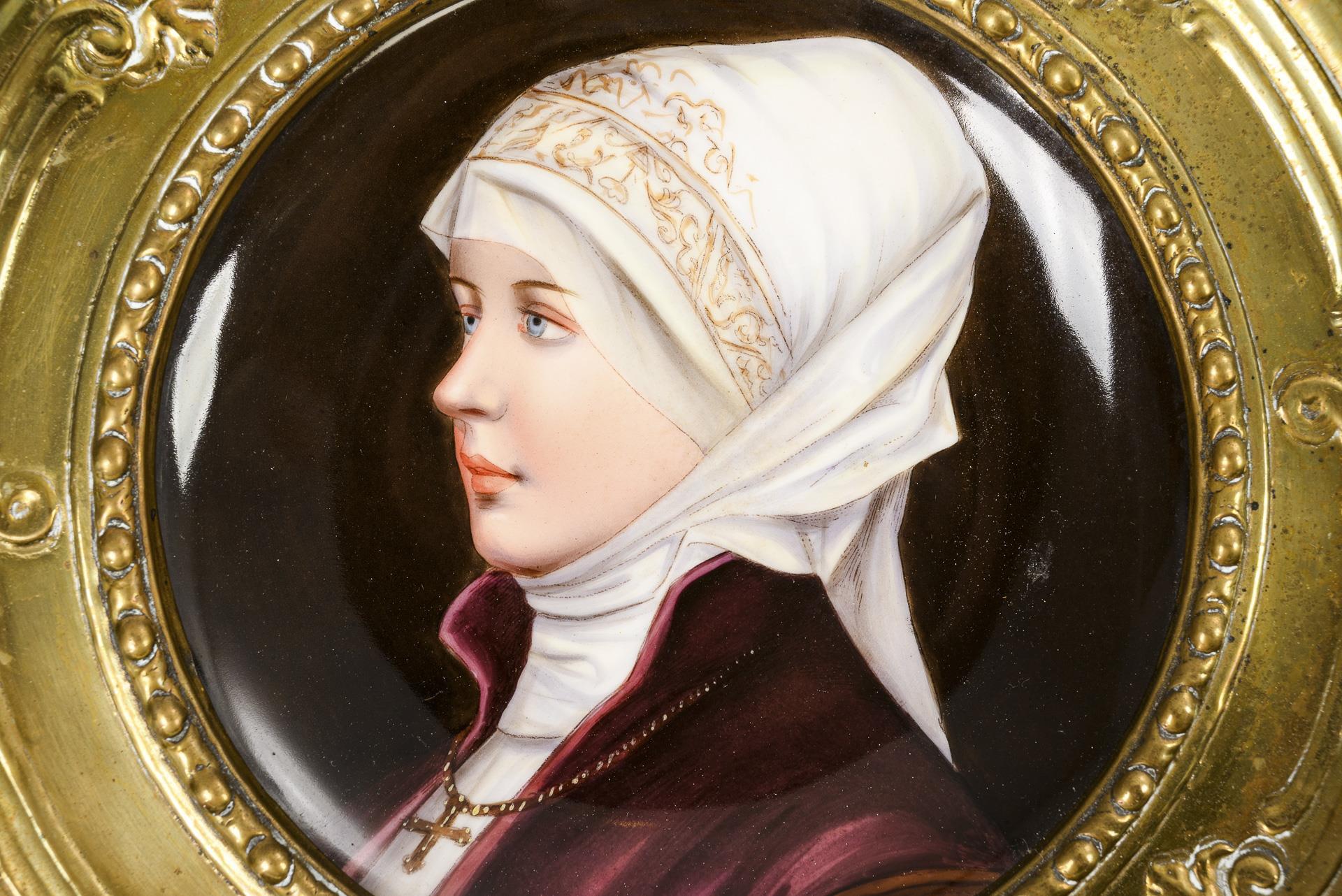 Bildnis einer jungen Schönheit mit weißem Kopftuch und Kreuzkette. In barocker Form geprägter Zierteller. Verso 1 Befestigungsklammer fehlt.