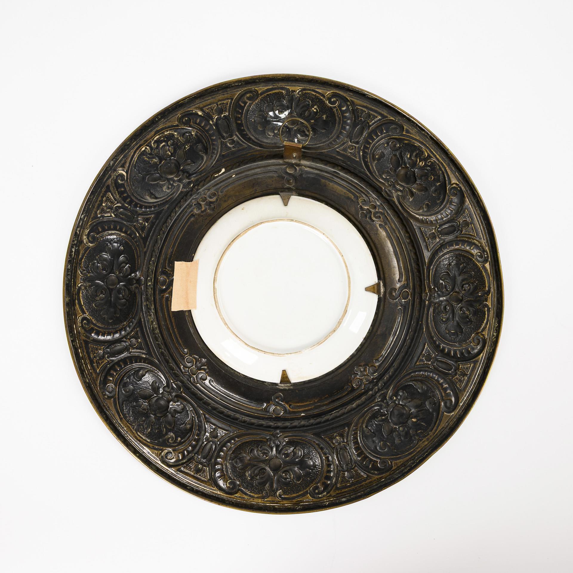 Porzellan, Malerei auf Umrissvordruck, Messingblech geprägt. Ø 40 cm. 0,6 kg.