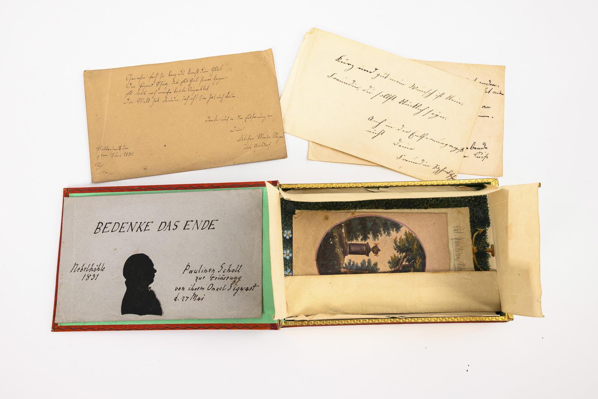 Buchförmige Freundschaftsalben ("liber amicorum"), 2x mit lose eingelegten Blättern, 2x als Buchbindung. Zahlreiche beschriebene Blätter, einige gefaltete Briefe. Dabei einige Aquarelle, etliche Kupferstriche bzw. Lithografien, häufig koloriert, geprägte Papierbilder, 1 Scherenschnitt, 5 Silhouettenbilder, 1 Bleistiftzeichnung. Das größte Album mit zahlreichen leeren Seiten. Teils leichtere Alters-/Gebrauchsspuren.