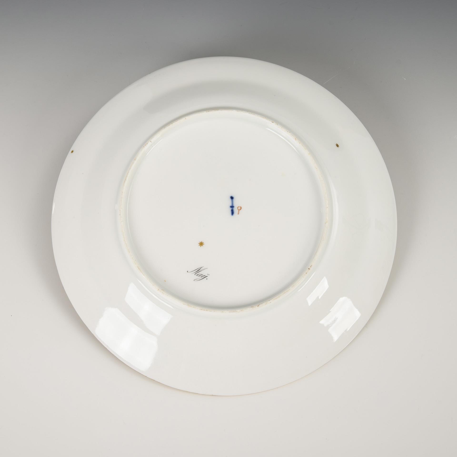 Teller mit floral goldradierter Fahne. Im Spiegel die allegorische Darstellung des Monats Mai: in einer Landschaft sitzendes Mädchenpaar an einem Blumenkorb, in den Wolken die grisaillegemalte Darstellung zweier Kinder für das Sternzeichen Zwilling.