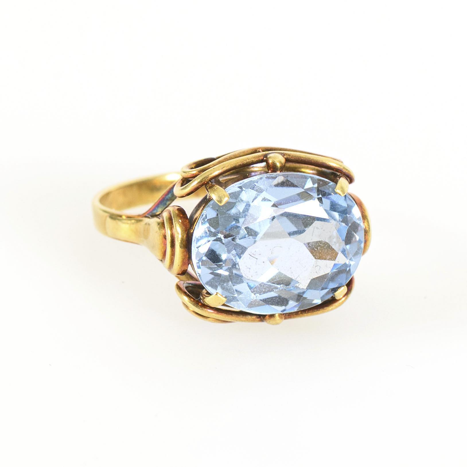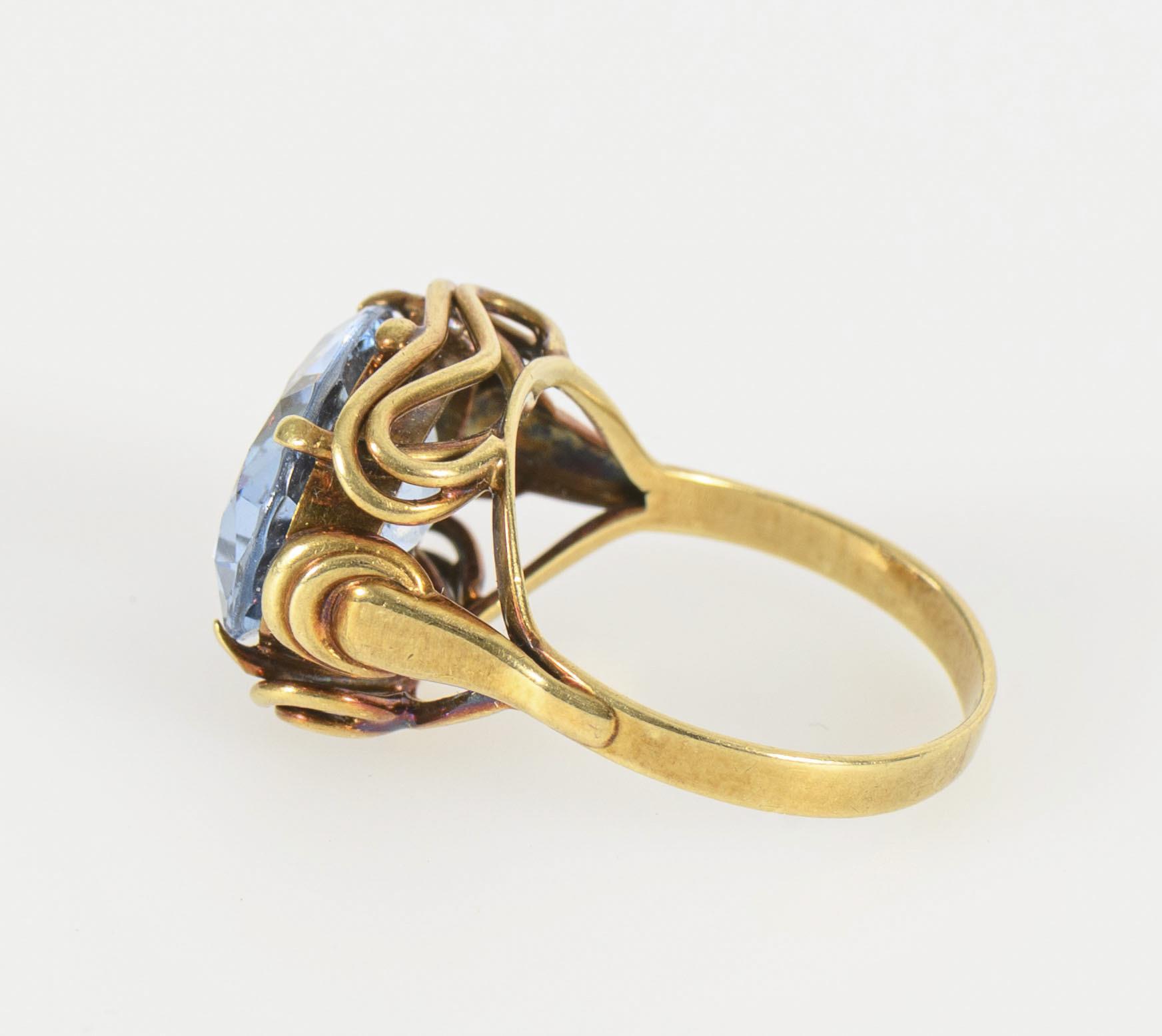 Vintage-Ring mit blauer Synthese in erhöht gearbeitetem, verziertem Ringkopf. Das Gold partiell mit Oxydationsspuren.
