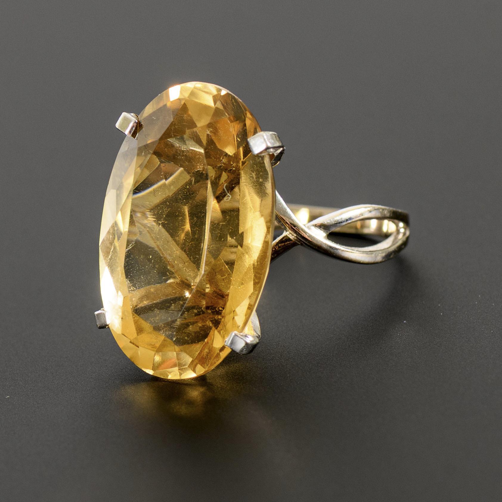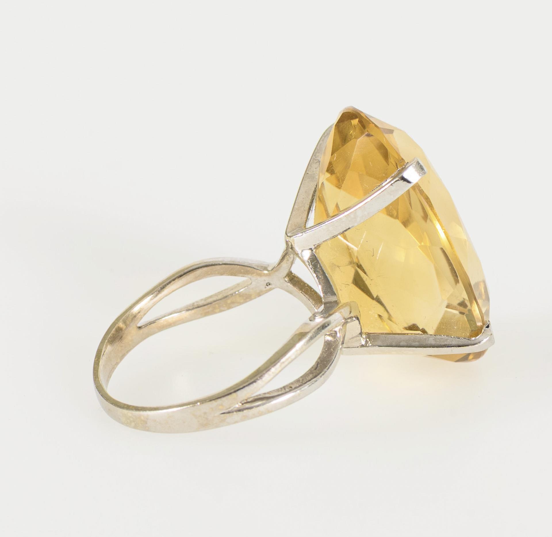 Weißgold 585 gestempelt. Ringgröße 58, der gelbe Farbstein (in der Fassung gemessen) 24,52 x 15,36 mm. 9,3 g.