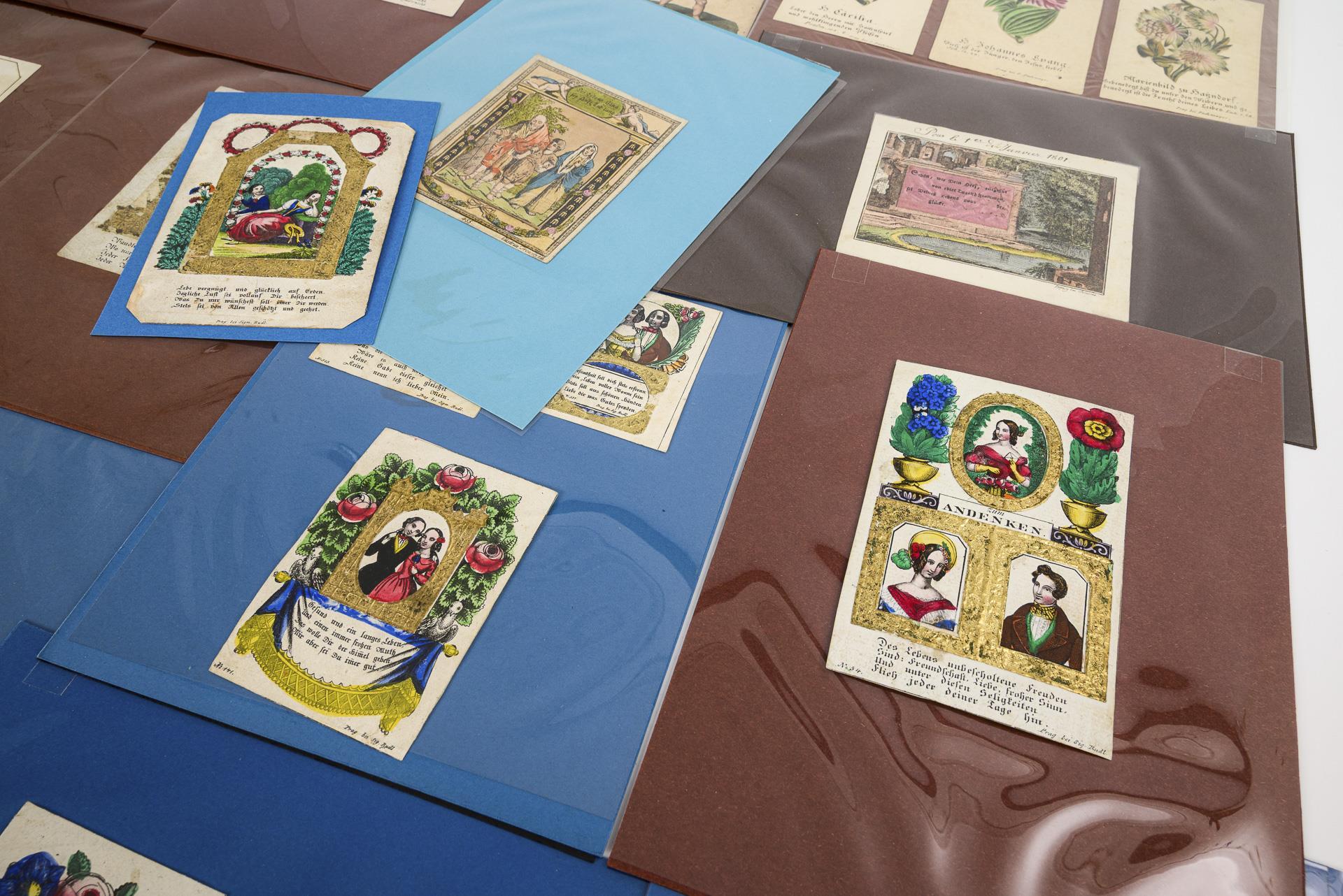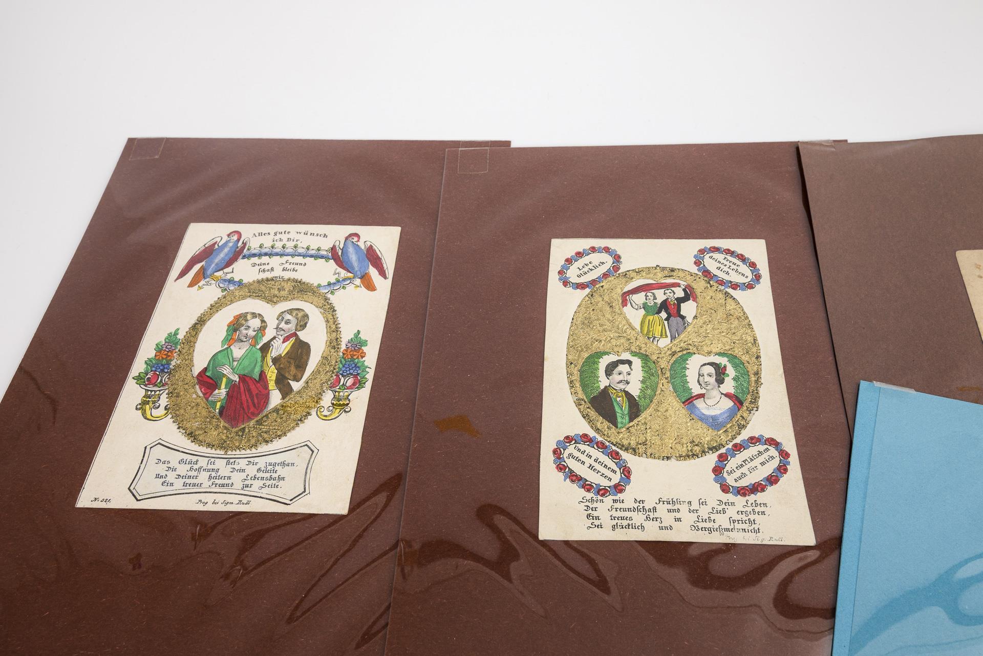 Zumeist Freundschaftsbilder, vereinzelt auch Sakrales, Lebensweisheiten und Glückwunsch für ein Liber amicorum. 12 Freundschaftsbilder mit aufgeklebten Papierrahmen mit Goldprägung. Herausgegeben u.a. von Rudl Prag, Pachmayer Prag, Cüstrin Trowitzsch, Sommer Leipzig, Johann Neidl Wien, Stölzel Prag usw. Wenige Alters-/Gebrauchsspuren.