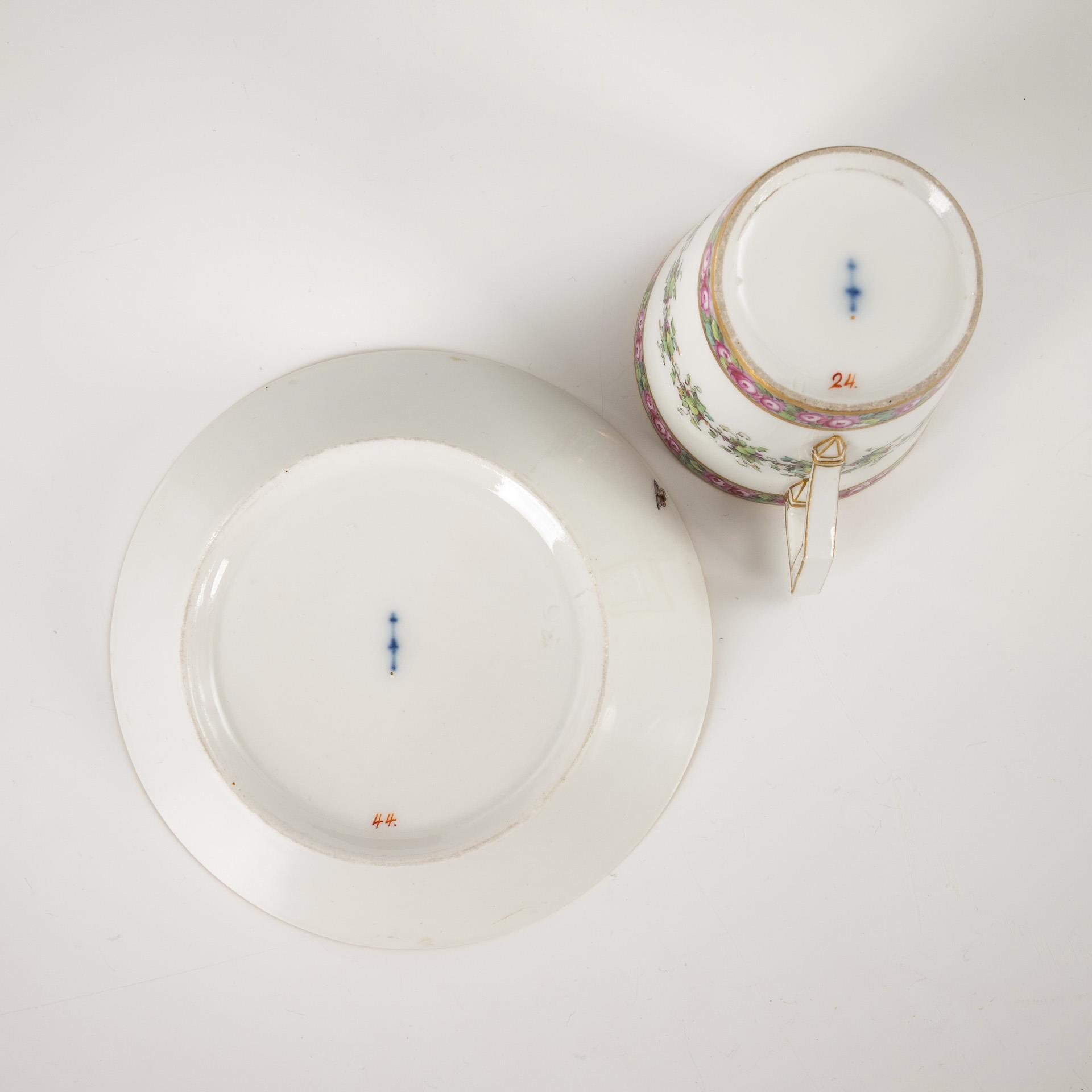 Polychrom bemalt, goldstaffiert. Tasse (H 6,5 cm), originale Untertasse (Ø 13 cm).