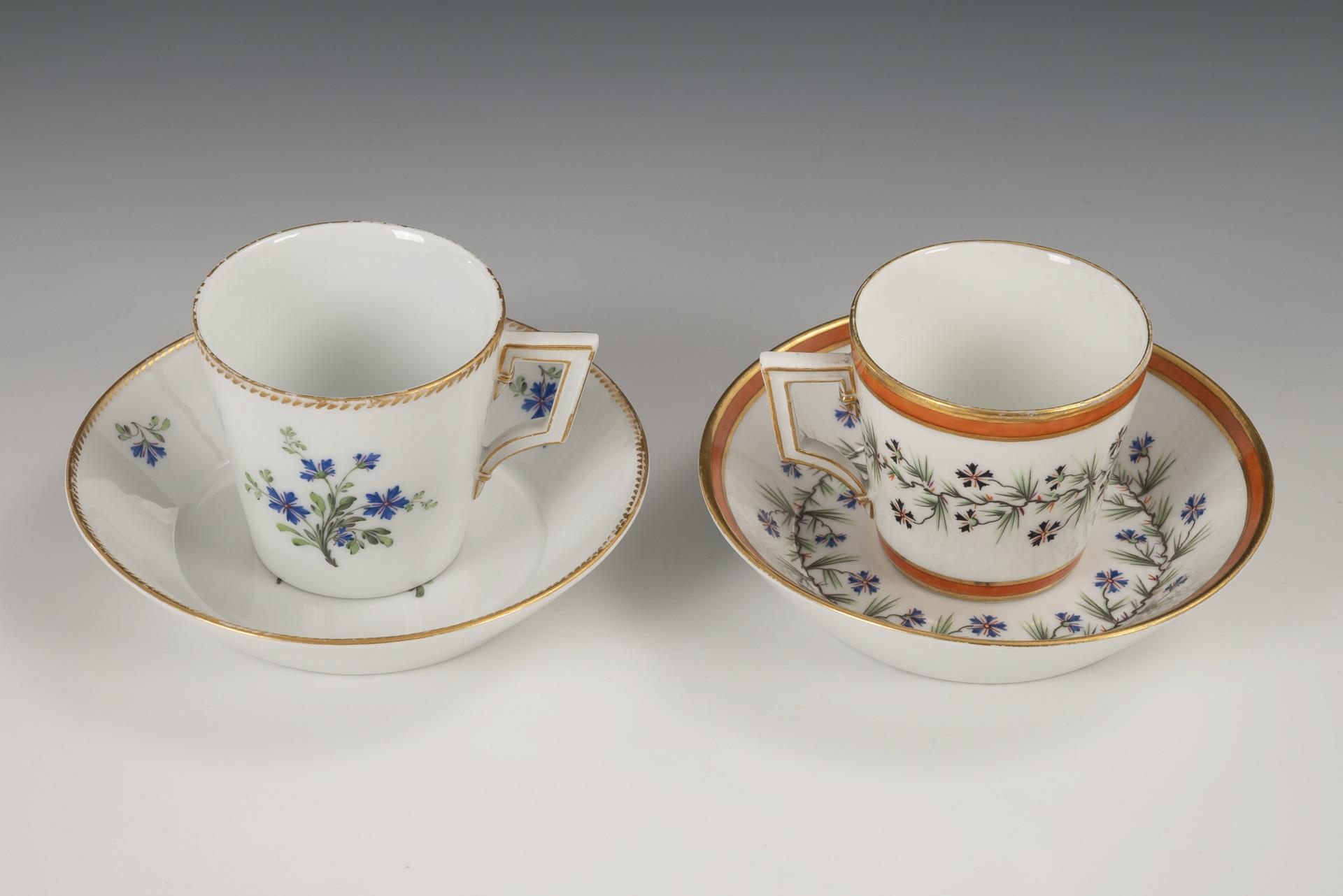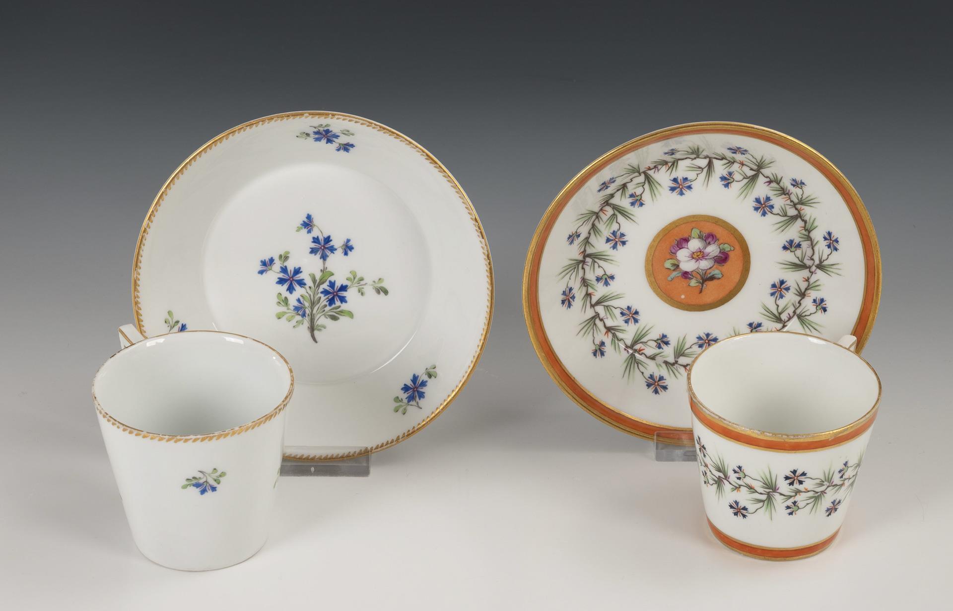 Modell "Konisch". 1x mit Kornblumenbukett und Kornblumenstreublüten. / 1x mit orangefarbenem Fondband, einer umlaufenden Kornblumen- und Grannengirlande sowie im Spiegel der Untertasse ein Zentralmedaillon mit Rosenblüte. Partiell minimaler Goldabrieb.