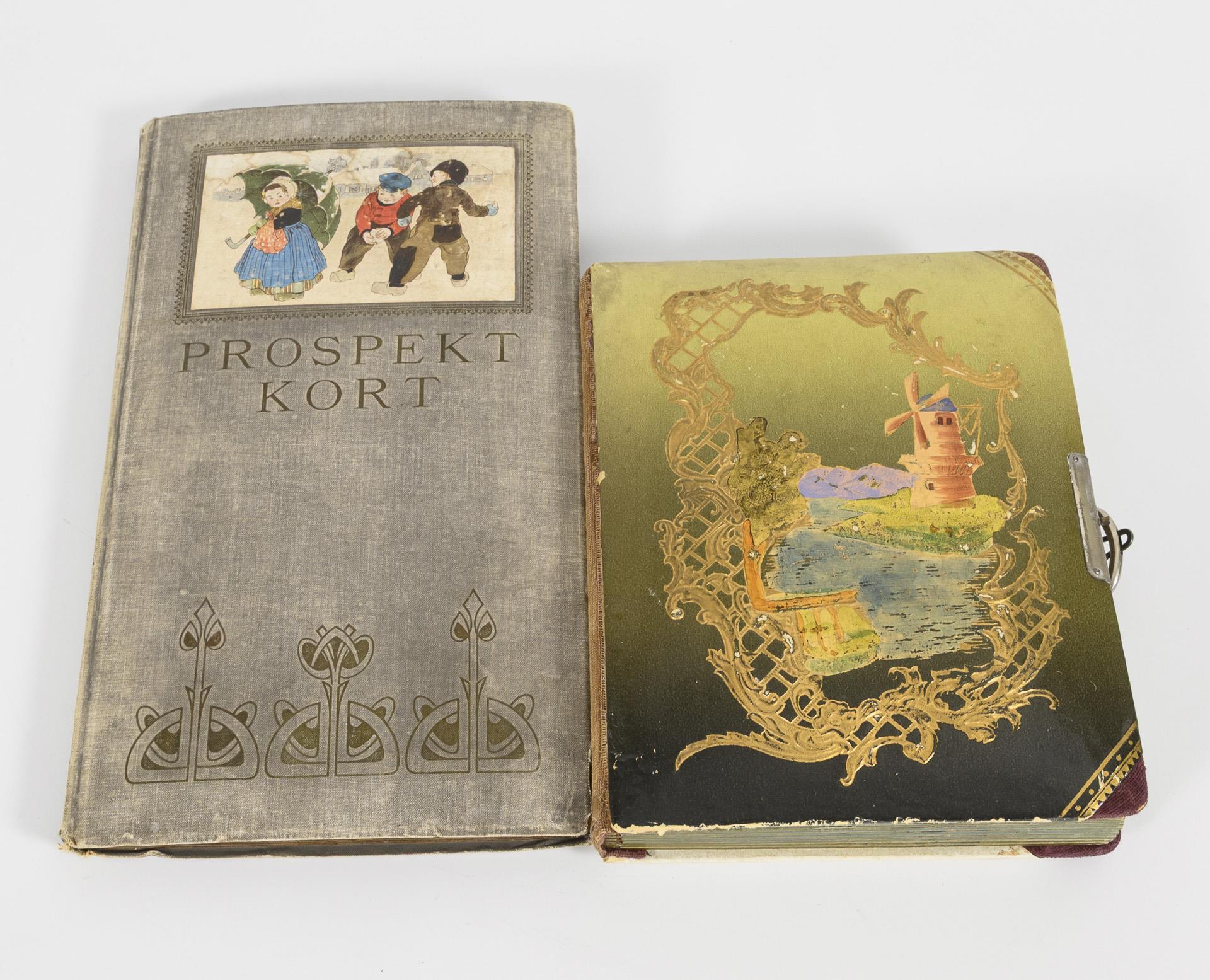 Album mit ca. 104 Ansichtskarten, darunter dänische Trachtendarstellungen und gestellte Spielszenen mit Käthe-Kruse-Puppen, aus den 50/60er Jahren, im grauen "Prospekt Kort" Album, 34 x 19 cm.