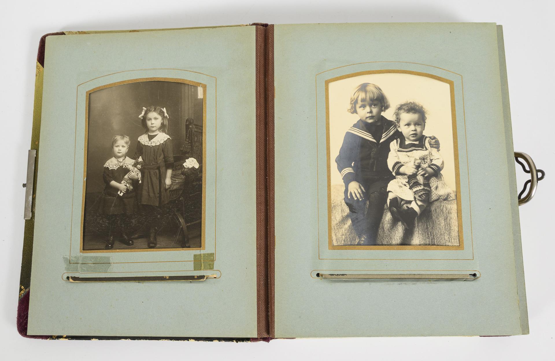 Album mit Fotos von Kindern, teils mit Spielzeug, ca. 41 Bilder, darunter viele mit Puppen. Im mehrfarbigen Album mit Mühle. 25 x 19 cm. /