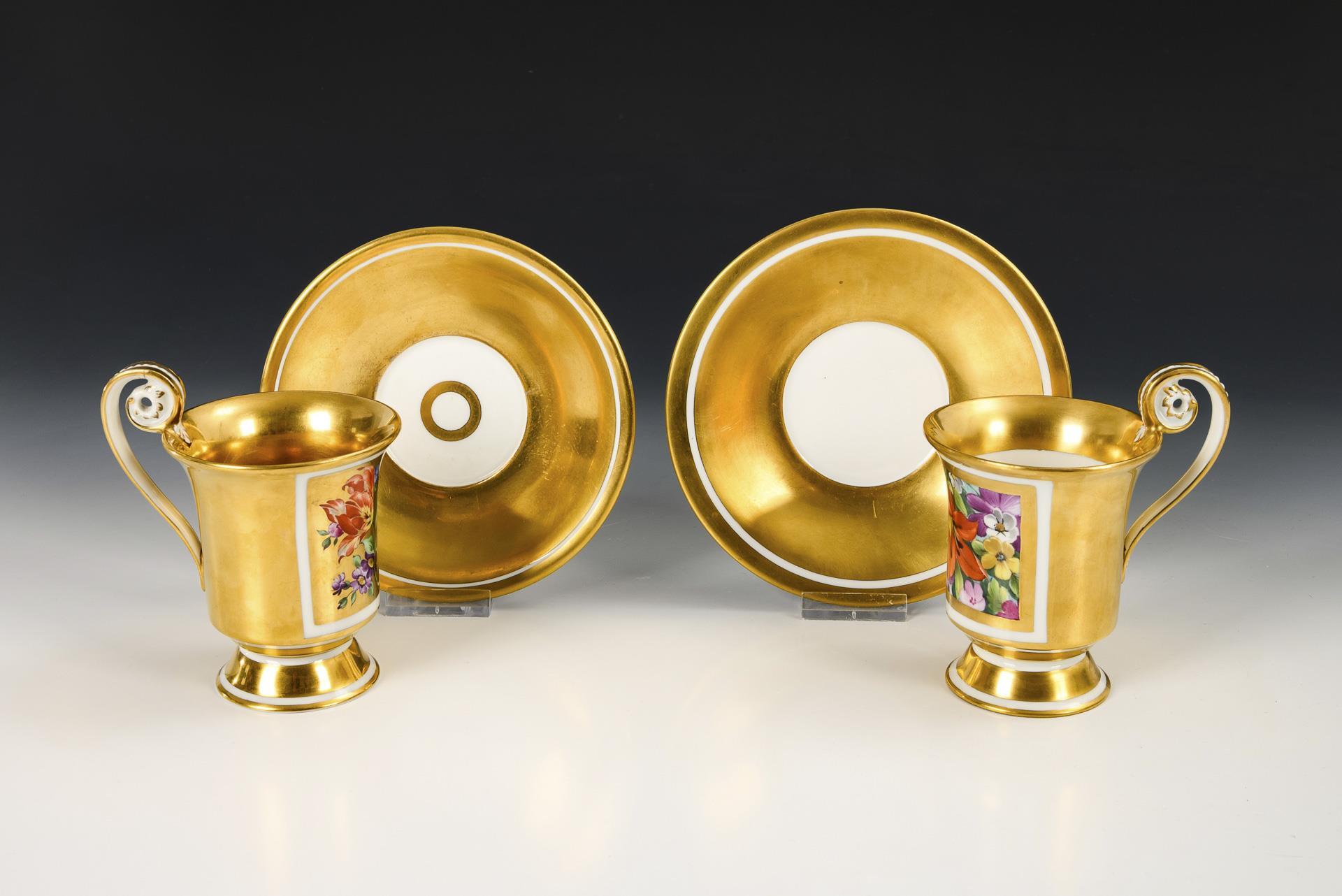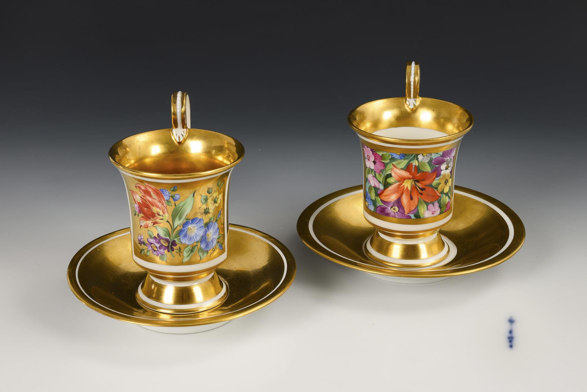 Gefußte Glockentassen mit Perlbandhenkel. Goldfond, schauseitig jeweils ein leuchtend farbiges Blumenbukett. 1x teils goldretuschierter Haarriss am oberen Henkelansatz.