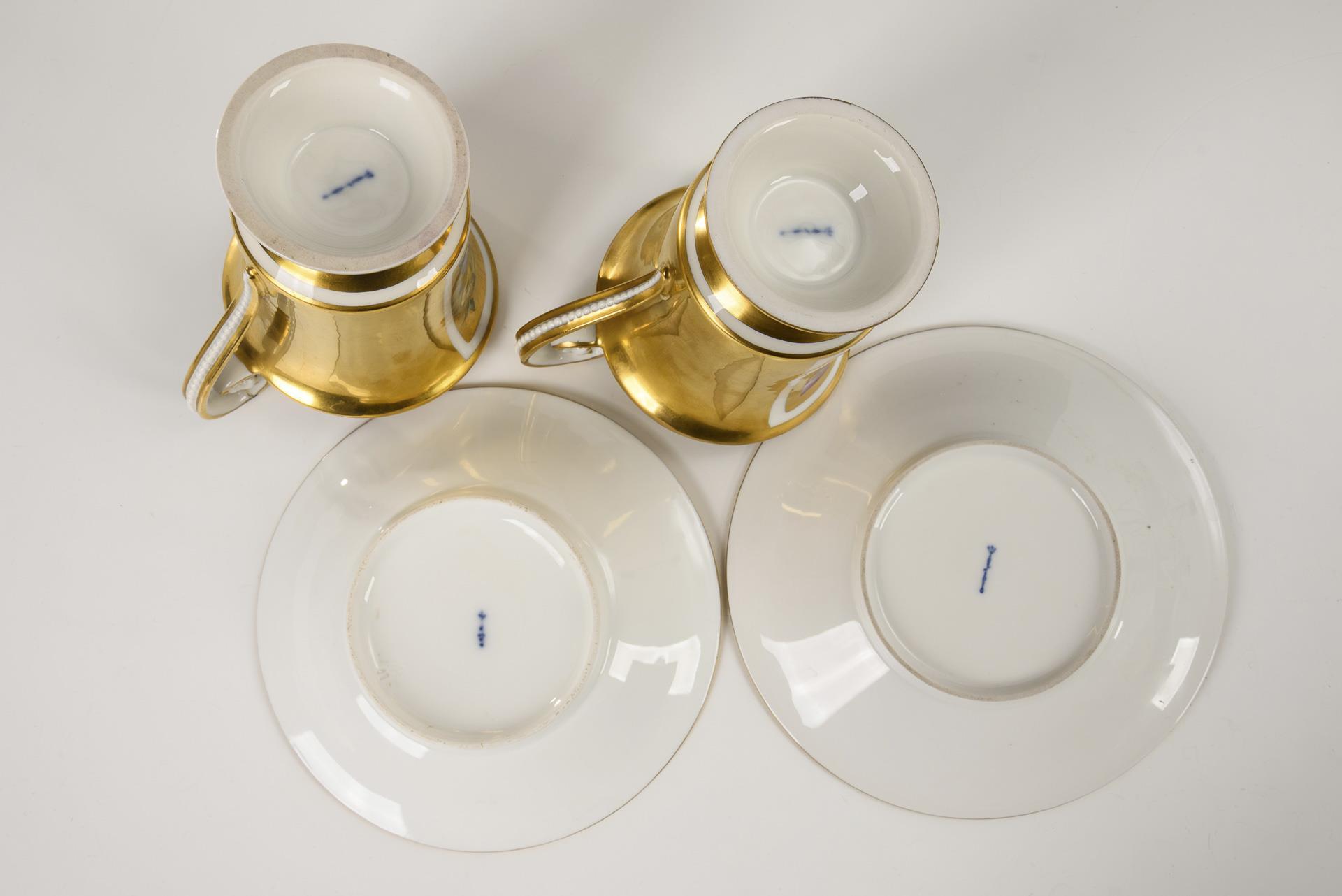 Polychrom bemalt, goldstaffiert. 2 Tassen (H 12 cm), 2 originale Untertassen (Ø 14,5 cm).