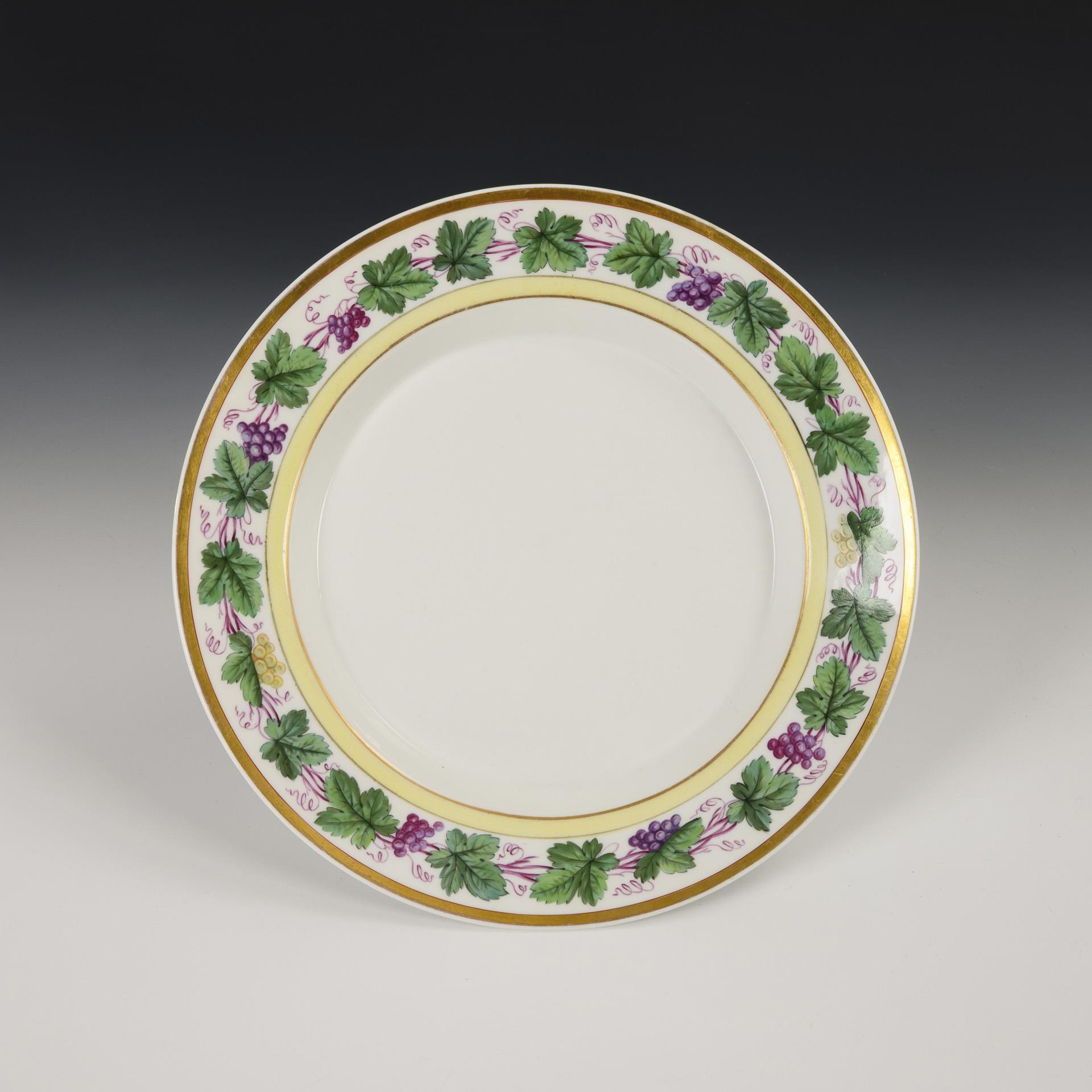 Teller aus der Nachlieferung zum Tafelservice mit coloriertem Weinlaub. Modell "Konisch". Auf der Fahne über einem gelben Fondstreifen eine Weinranke mit weißen und blauen Trauben, Goldrand. 1 kleine Randrestaurierung.