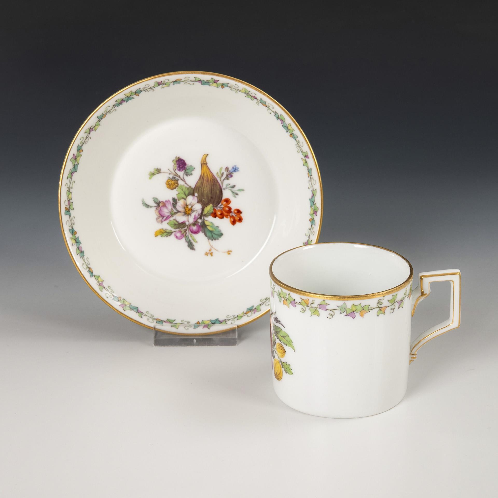 Form "Antikglatt". Unter einer Weinlaubbordüre ein Fruchtbukett mit Birne, Brombeeren und Stachelbeeren, im Spiegel der Untertasse ein Bukett mit Feige, Brombeere und Hagebutten. Standring der Untertasse restauriert, Tasse mit restauriertem Wandungshaarriss.