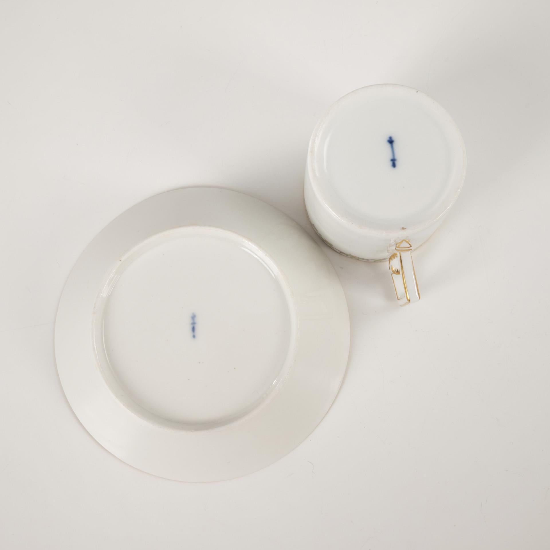 Polychrom bemalt, goldstaffiert. Tasse (H 6 cm), originale Untertasse (Ø 13 cm).