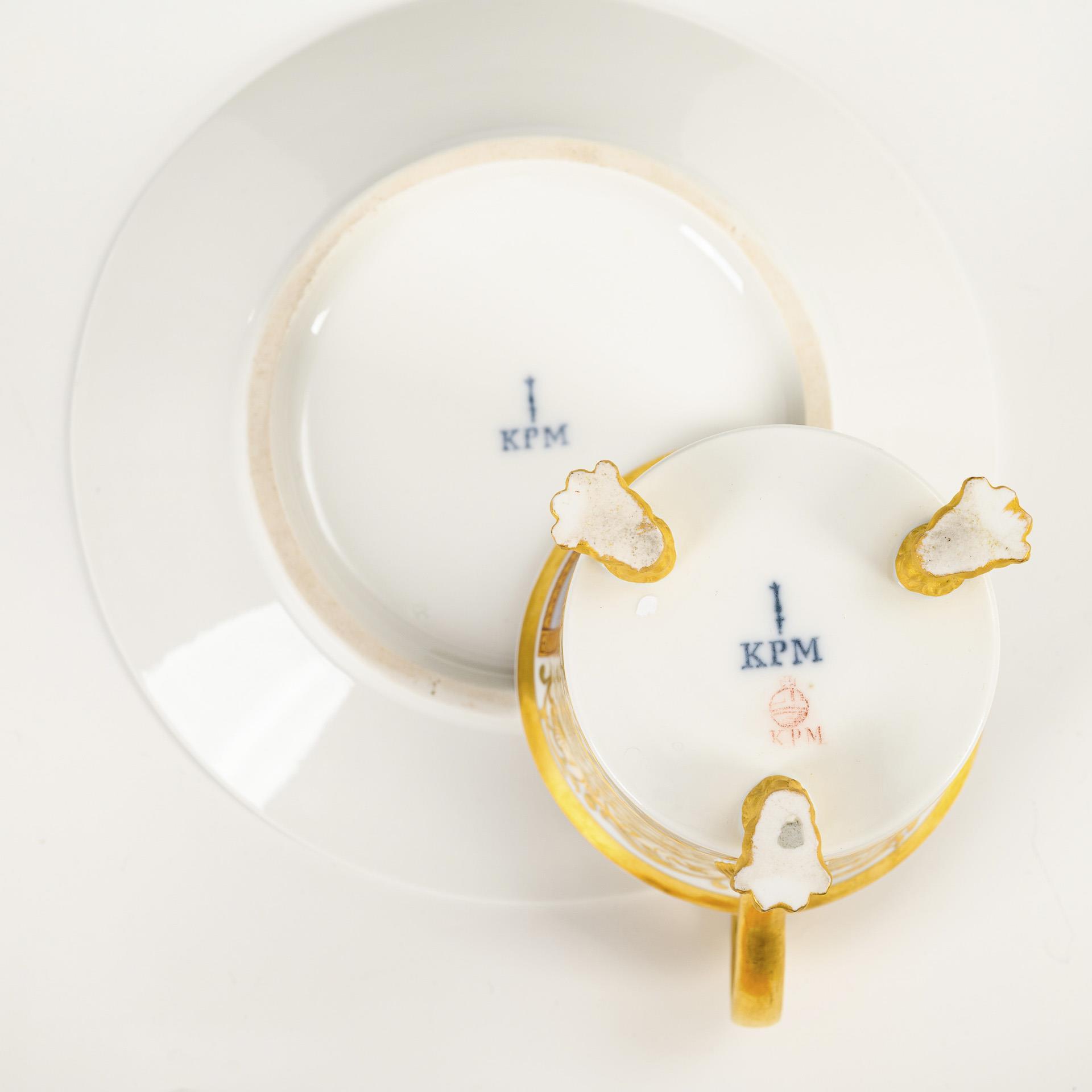 Polychrom bemalt, goldstaffiert. Tasse (H 13,5 cm), ergänzte Untertasse (Ø 18,5 cm).