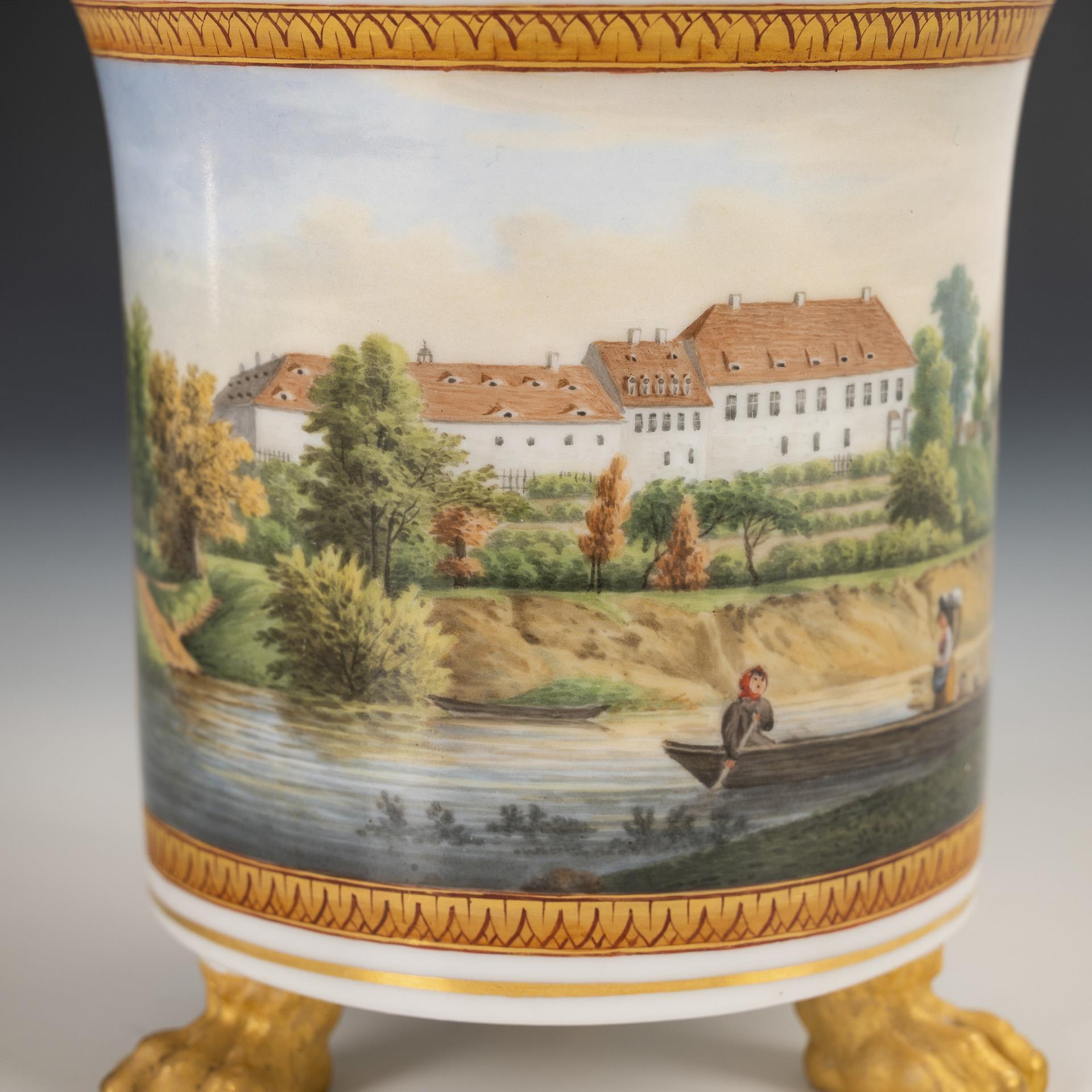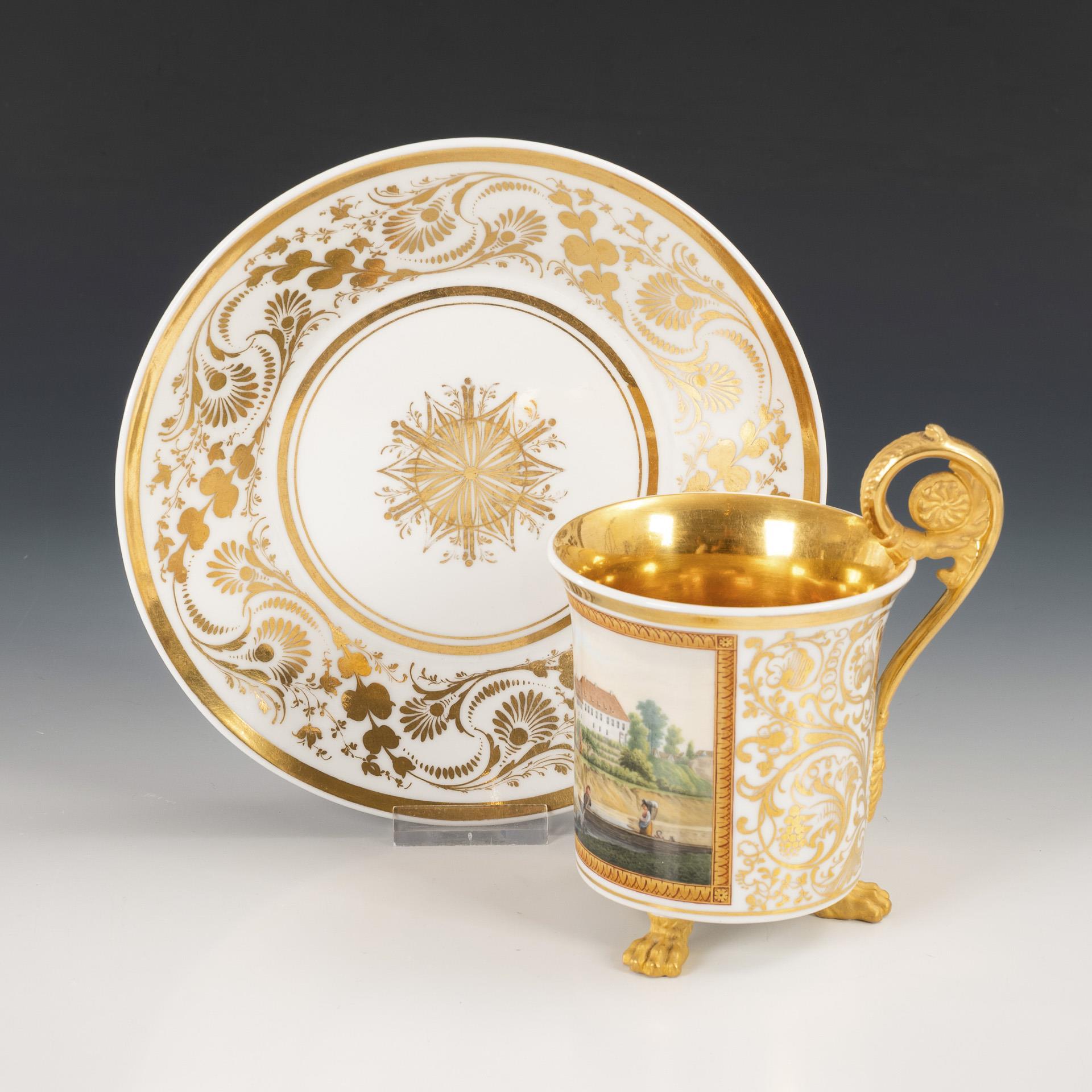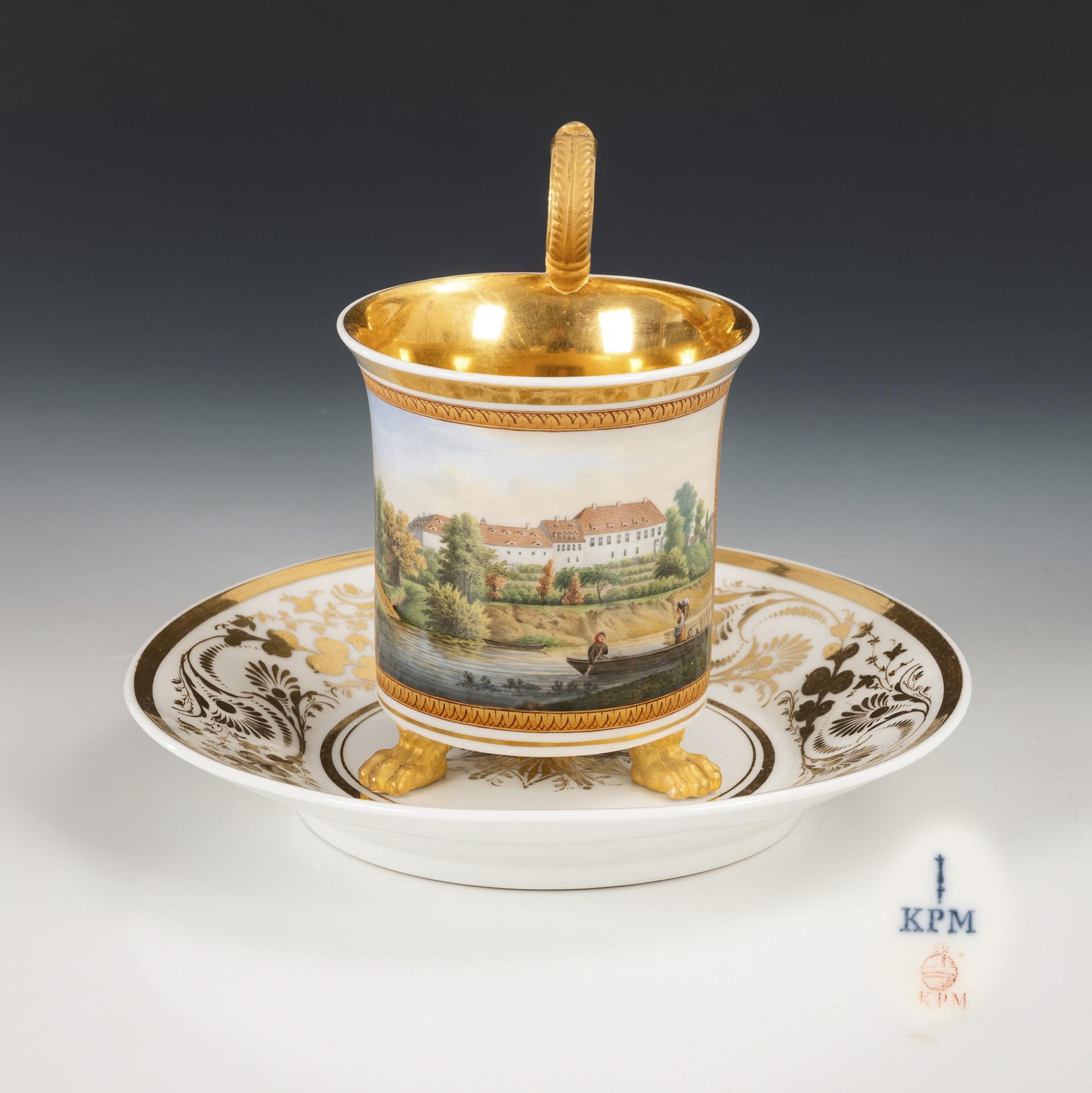 Zylindertasse mit Kraterrand, teils goldbronziertem Rosettenhenkel und drei Tatzenfüßen. Schauseitig eine goldgerahmte Rechteckkartusche mit der Ansicht eines Schlosskomplexes mit vorgelagertem Fluss, Boot und Figurenstaffage, innen vergoldet. Haarriss am oberen Henkelansatz.