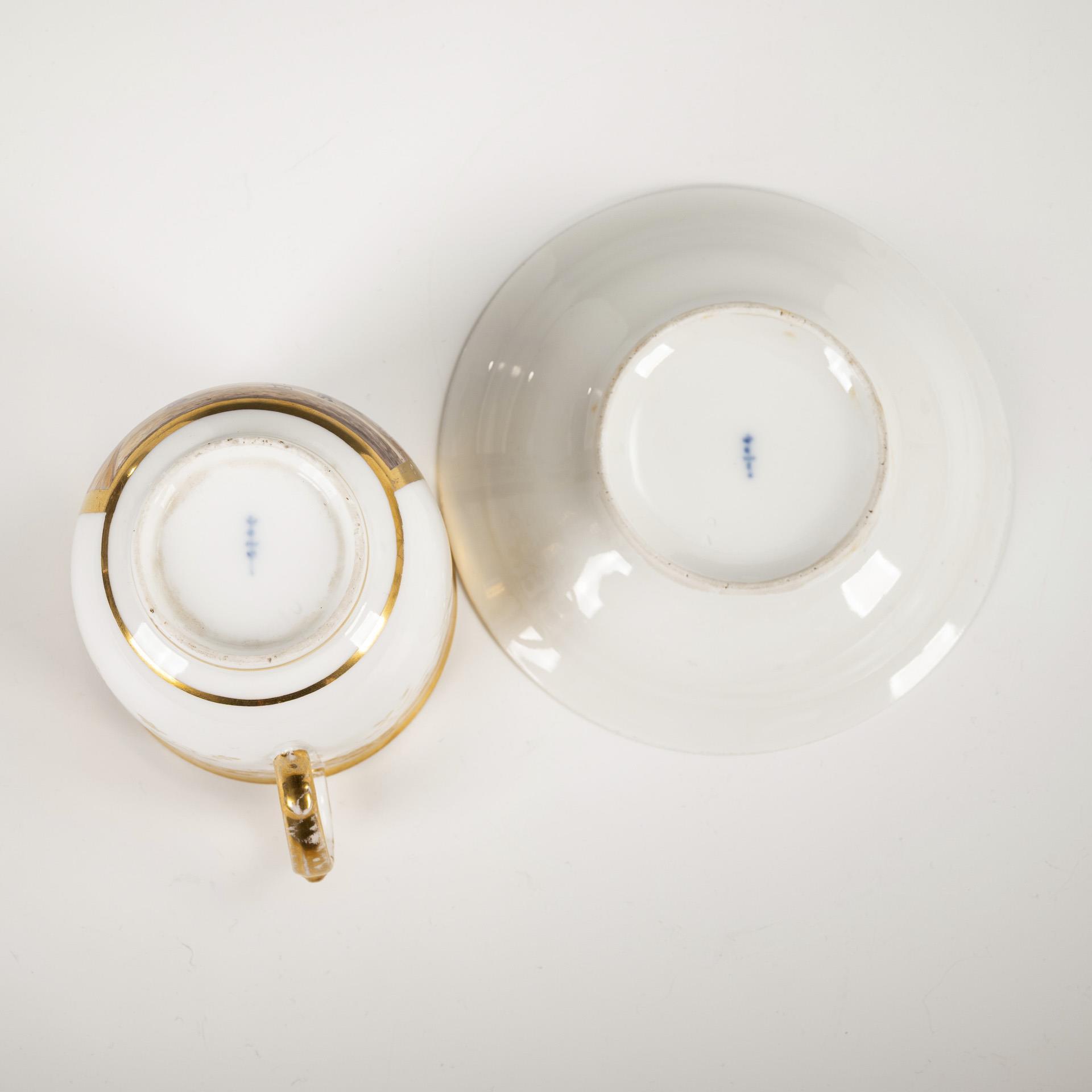 Polychrom bemalt, goldstaffiert. Tasse (H 9 cm), ergänzte Untertasse (Ø 14 cm).