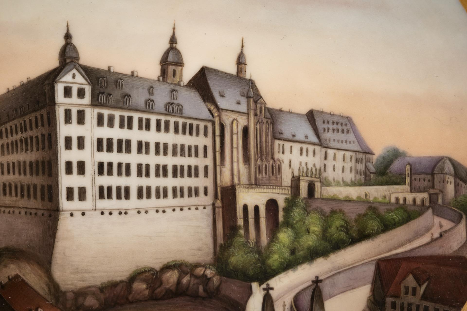 Glatter Teller mit der Darstellung des Altenburger Schlosses im goldgerahmten Spiegel, rosafarbene Fahne mit goldgemaltem vegetabilen Dekor.