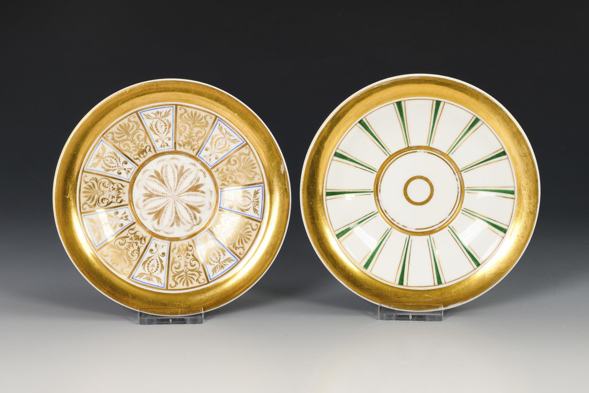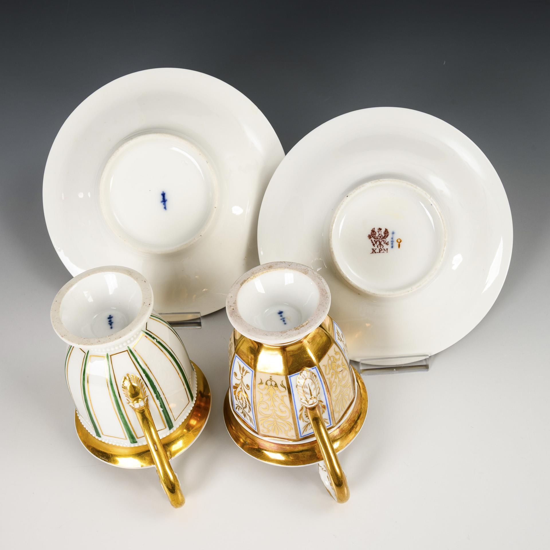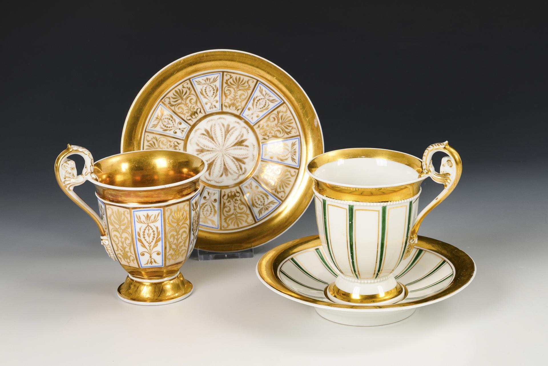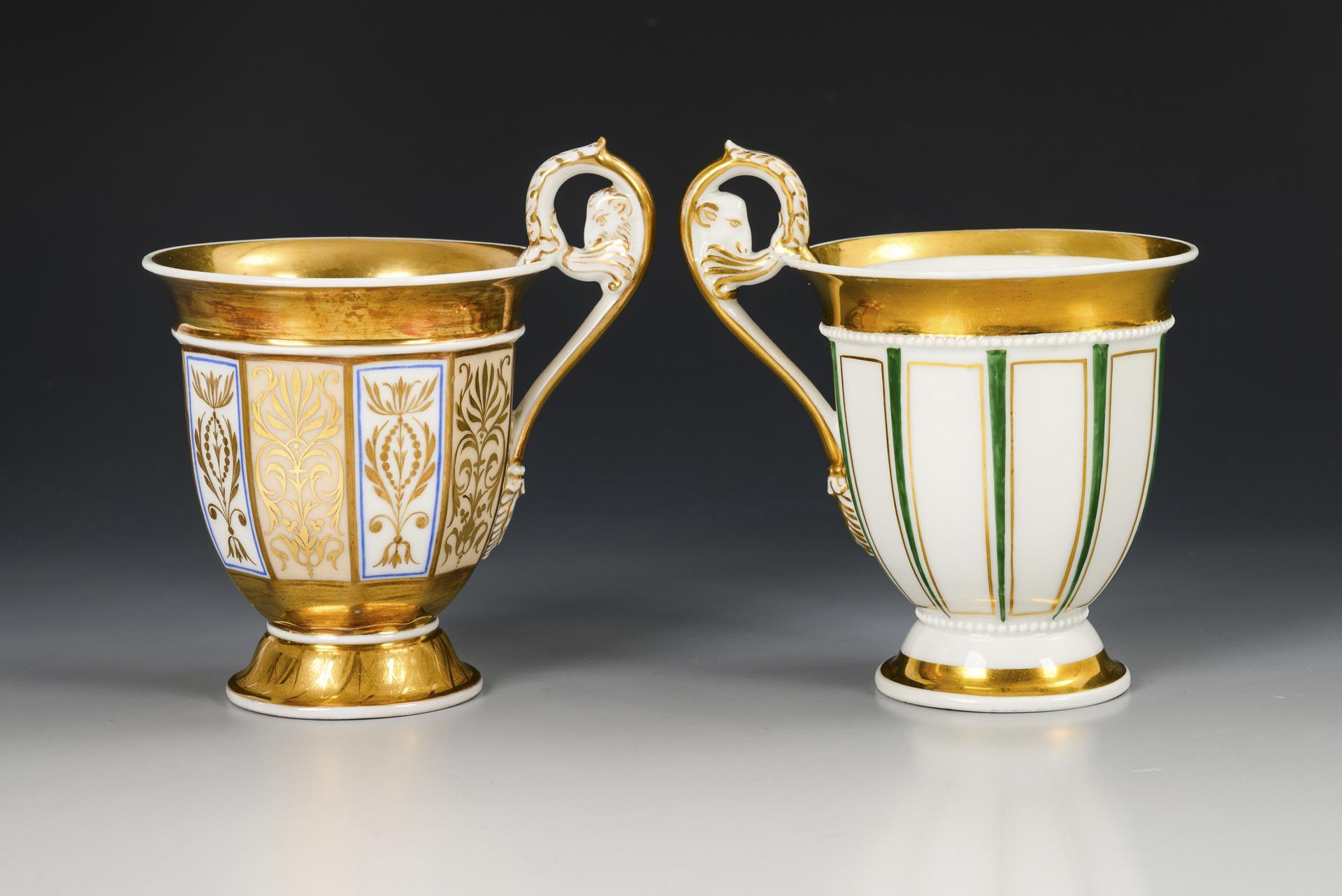 Gefußte, zehnkantige Glockentassen mit Widderkopfhenkel. 1x Zeptermarke, um 1830: mit Perlbändern, grünen und goldenen Streifen. / 1x Zeptermarke und rotbraune Adlermarke, 1823-1832: mit vegetabiler Goldmalerei auf alternierend weißem und cremefarbenem Fond sowie goldenem Teilfond. Goldretusche an 1 Untertassenrand.