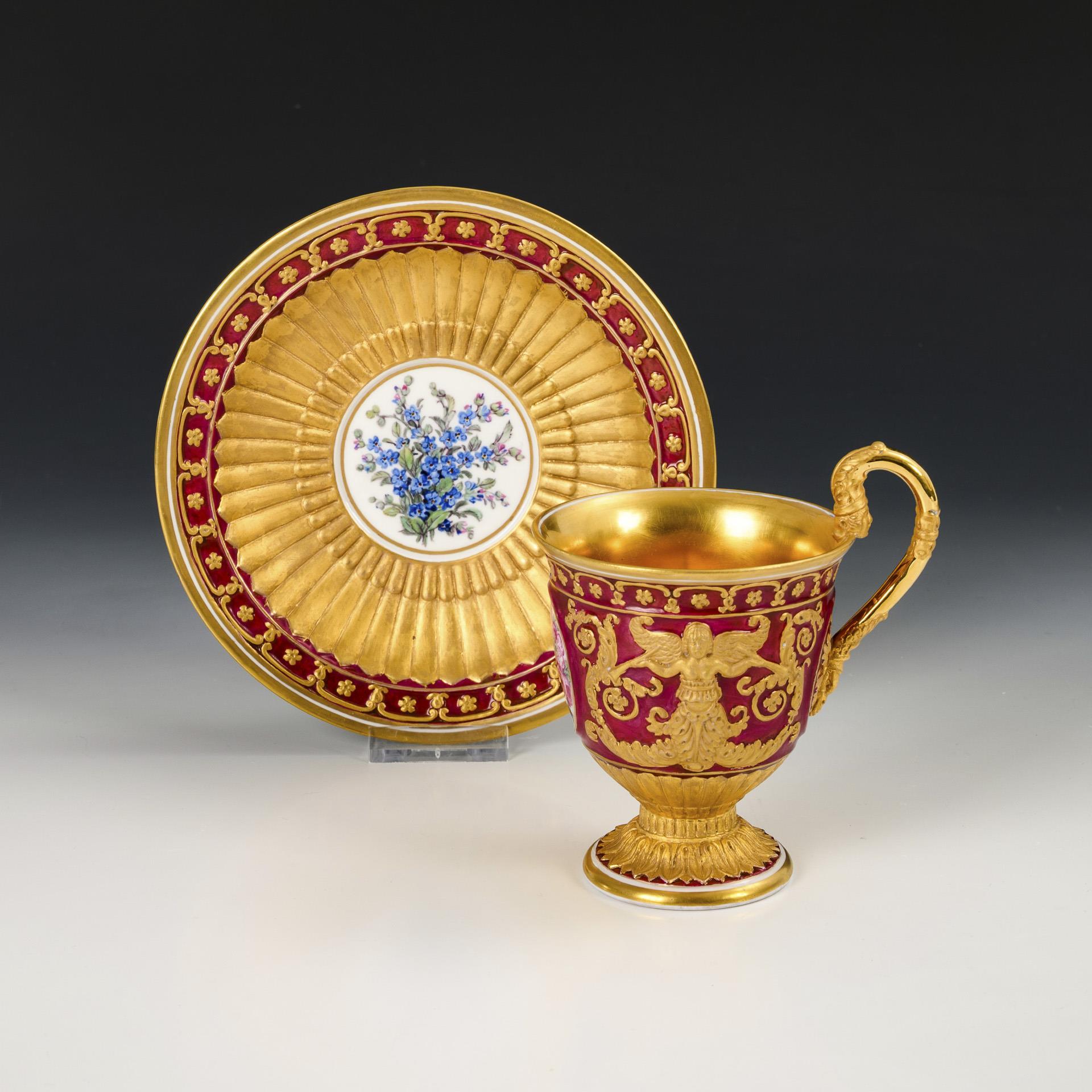 Gefußte, reich reliefierte Glockentasse mit Grotesken, Teilgodronierung und Blütenbordüre sowie Schwanenhenkel mit Maskaron. Goldbronzierte Reliefs und Purpurfond, schauseitig auf der Tasse ein Ovalmedaillon mit einem Rosenbukett, im Spiegel der Untertasse ein Vergißmeinnichtbukett, innen vergoldet.