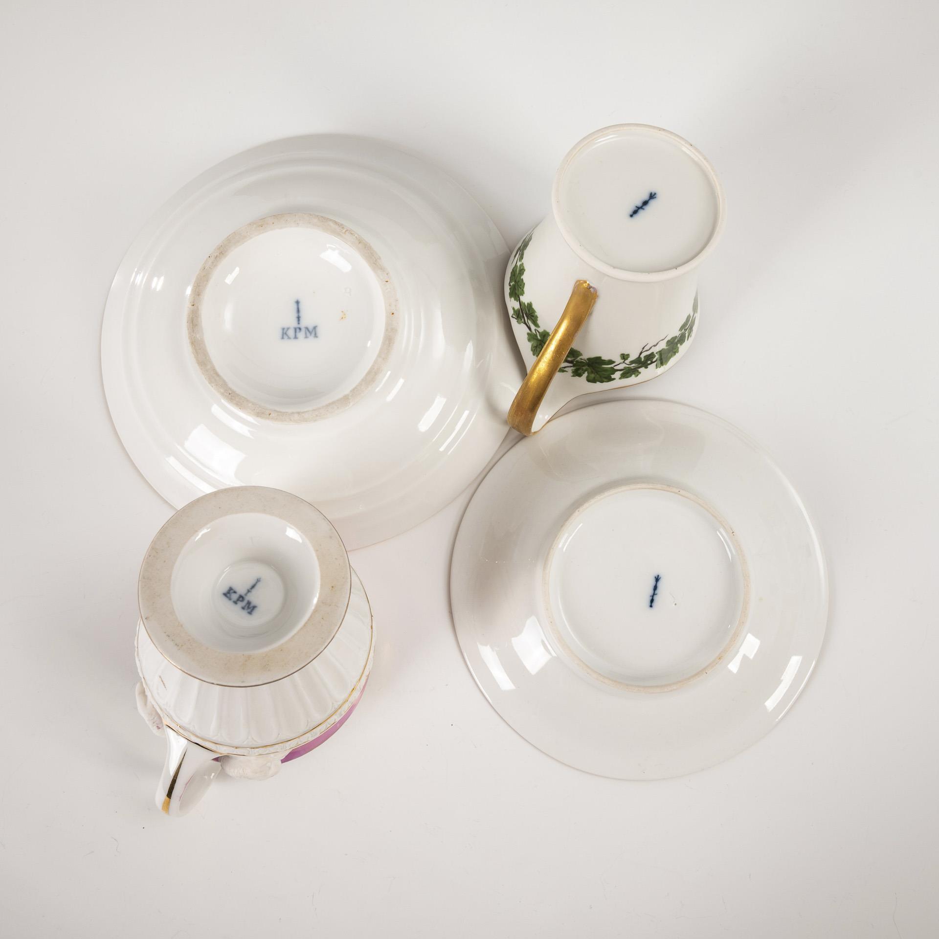 1x Zeptermarke, KPM, 1837-1844: gefußte Glockentasse mit Schwanenhenkel, vertikaler Kannelierung, Biskuit-Reliefband und lüstriertem rosa Fondband. / 1x Zeptermarke, 1. H. 20. Jh.: Form "Konisch" mit Campanerhenkel; unterhalb des Mündungsrandes eine Weinlaubbordüre. Beide Tassen ohne Malereimarke.