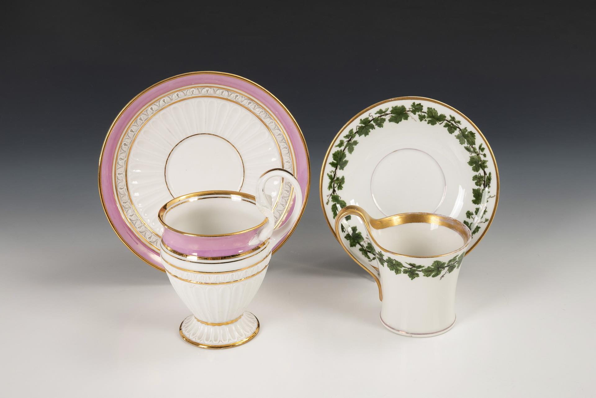 Polychrom bemalt, goldstaffiert. 2 Tassen (H 12 und 9 cm), 2 originale Untertassen (Ø 16 und 14 cm).