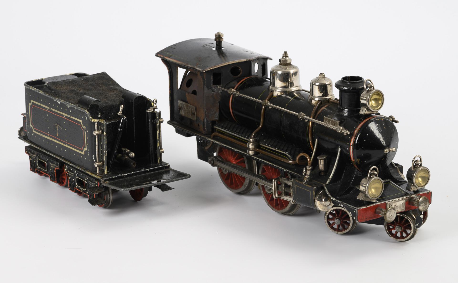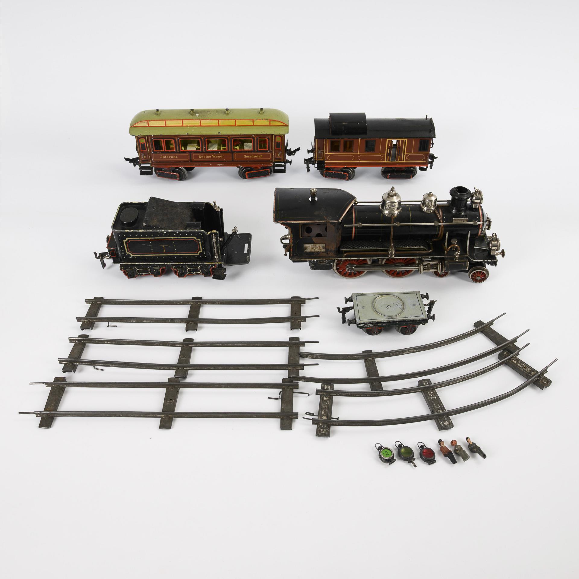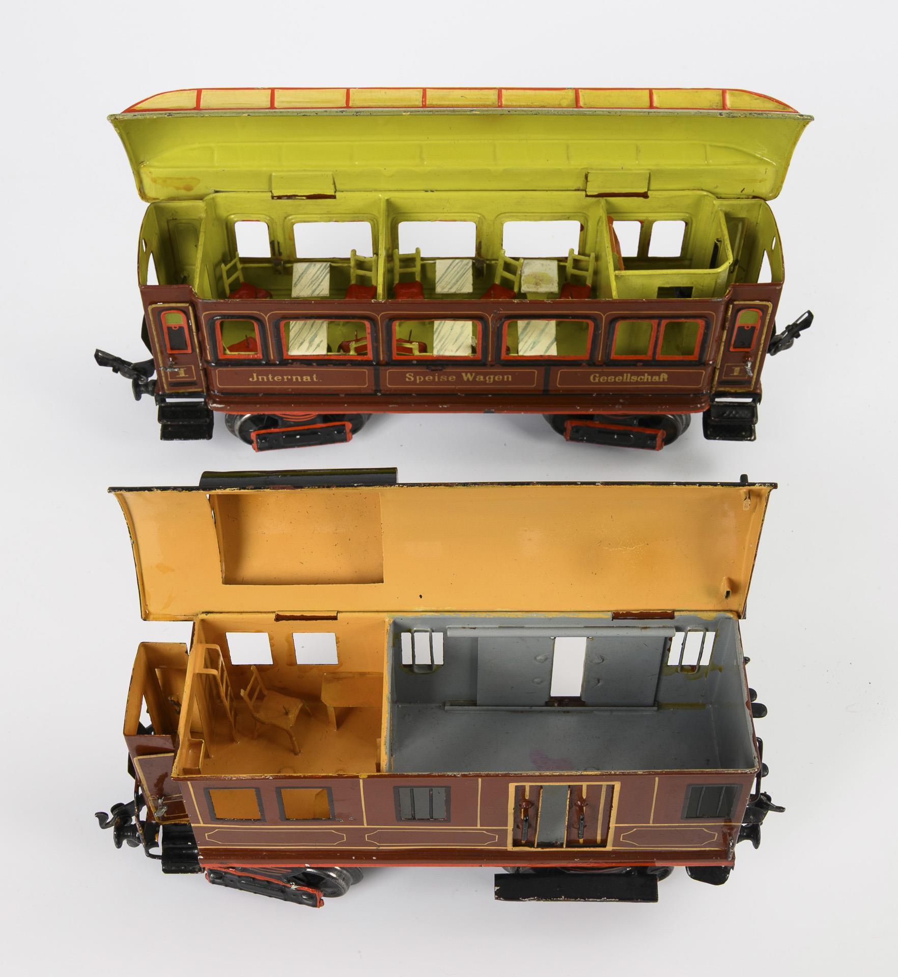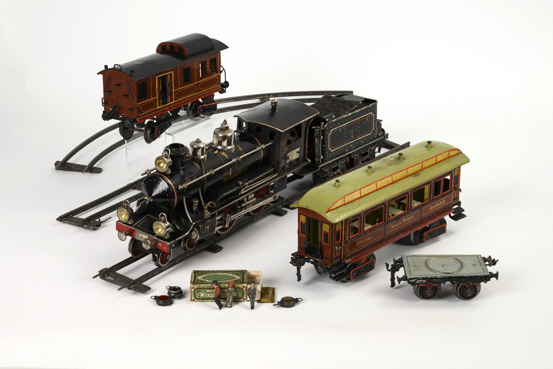 Spur 1. Schwarze Spiritus-Lok (L 38 cm) mit originalem Tender (L 25 cm). / Seltener Speisewagen "Internat. Speise Wagen Gesellschaft" mit Einrichtung (L 31 cm). / Brauner Gepäckwagen mit kleinem Schaffner-Abteil (L 25,5 cm). Dazu kleiner Flachwagen und 5 Weißblech-Schienenstränge. Bespielt, Funktion nicht geprüft.