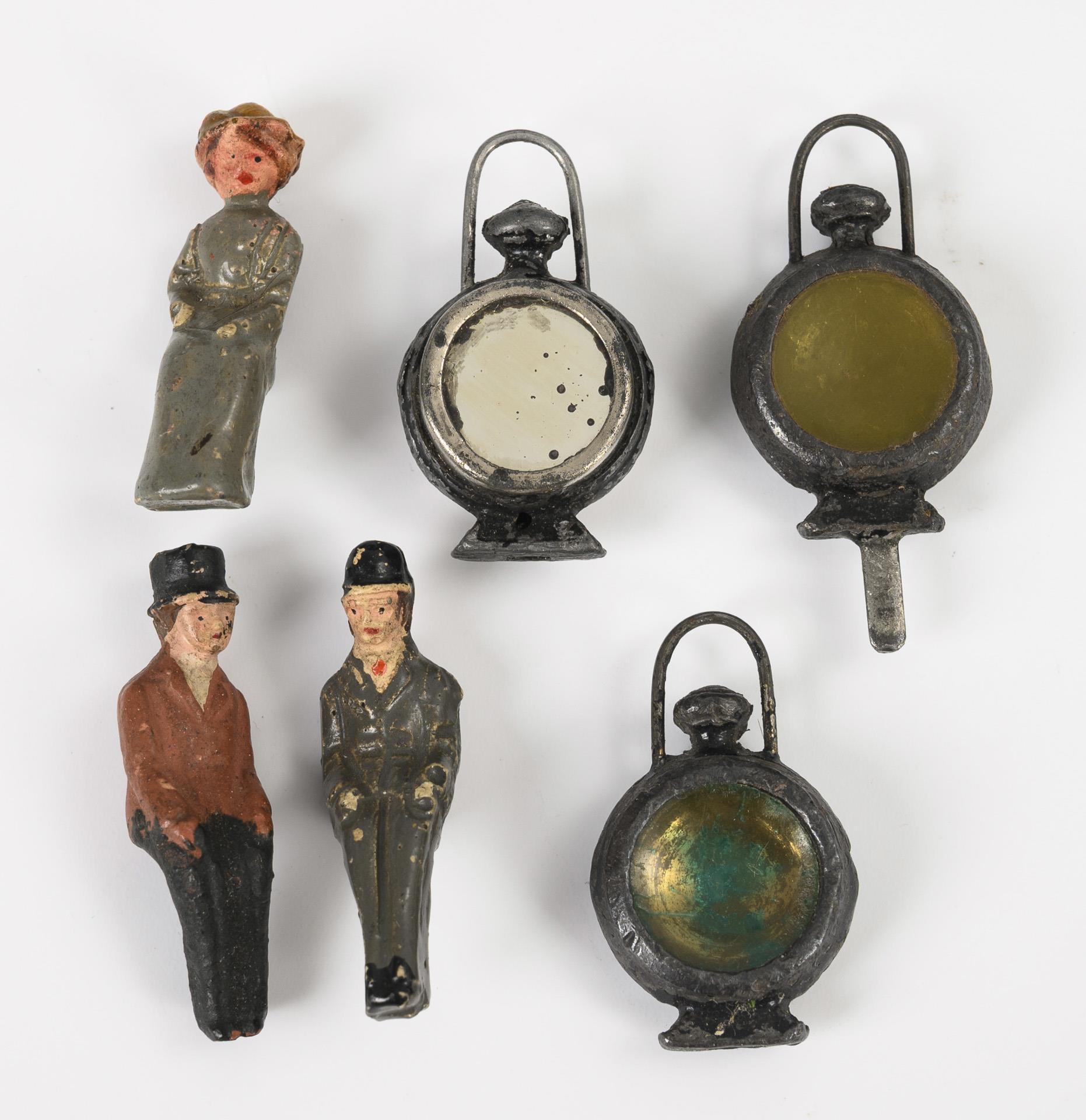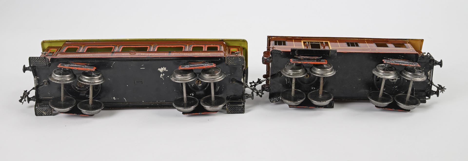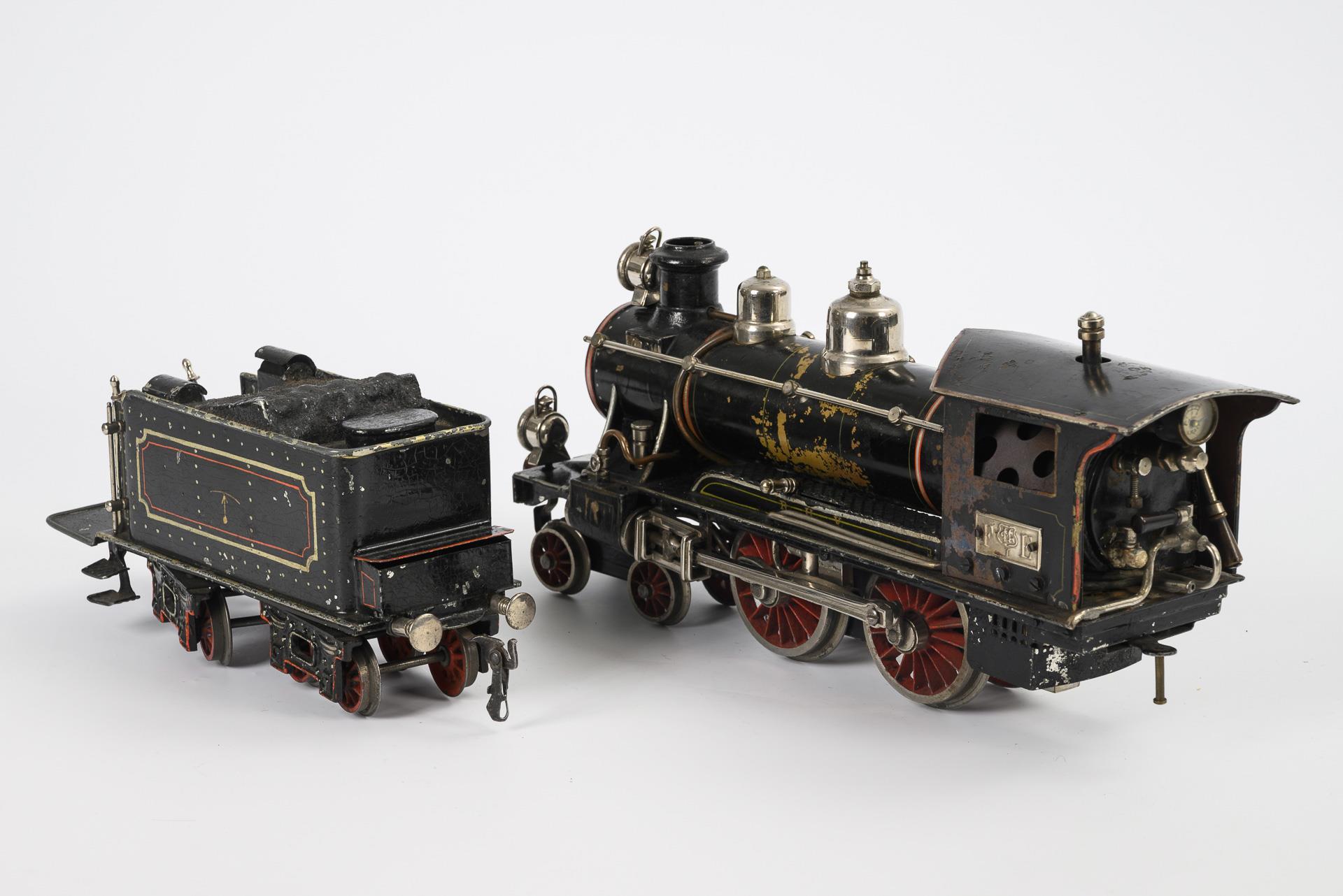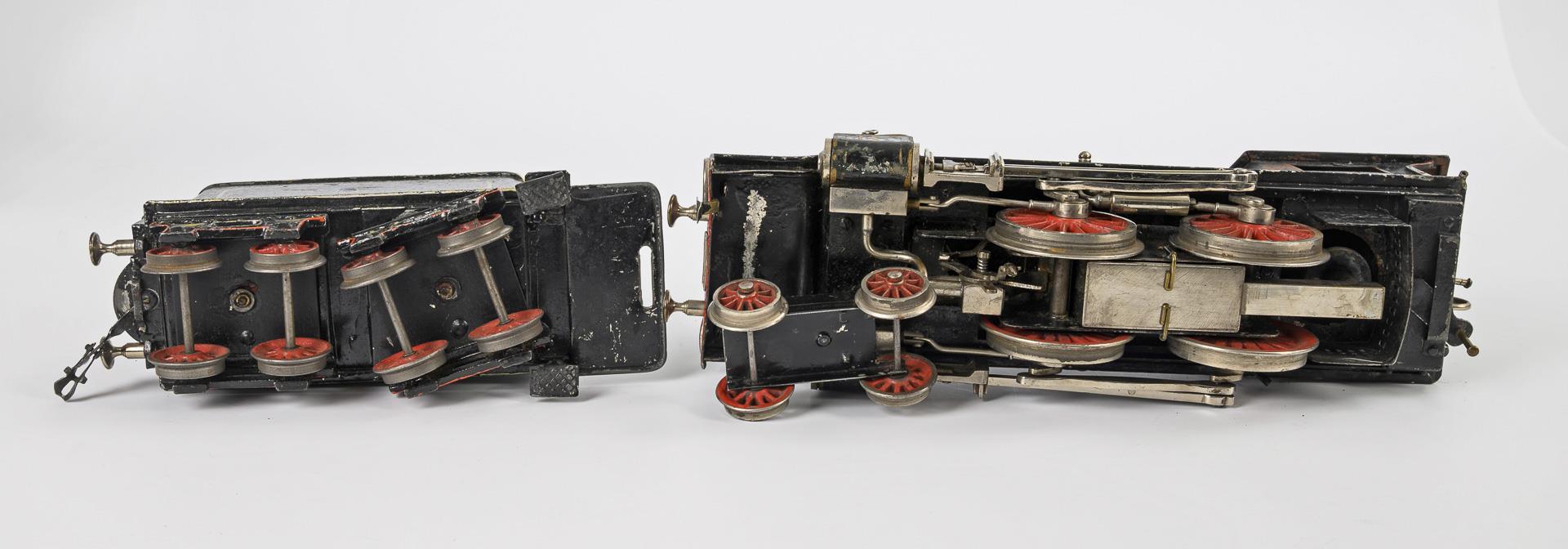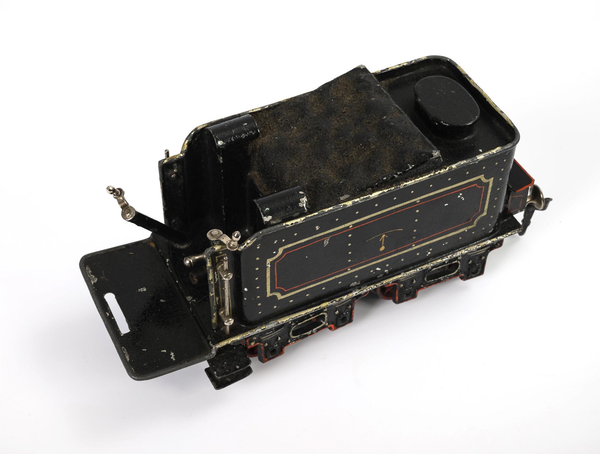 Spur 1. Schwarze Spiritus-Lok (L 38 cm) mit originalem Tender (L 25 cm). / Seltener Speisewagen "Internat. Speise Wagen Gesellschaft" mit Einrichtung (L 31 cm). / Brauner Gepäckwagen mit kleinem Schaffner-Abteil (L 25,5 cm). Dazu kleiner Flachwagen und 5 Weißblech-Schienenstränge. Bespielt, Funktion nicht geprüft.