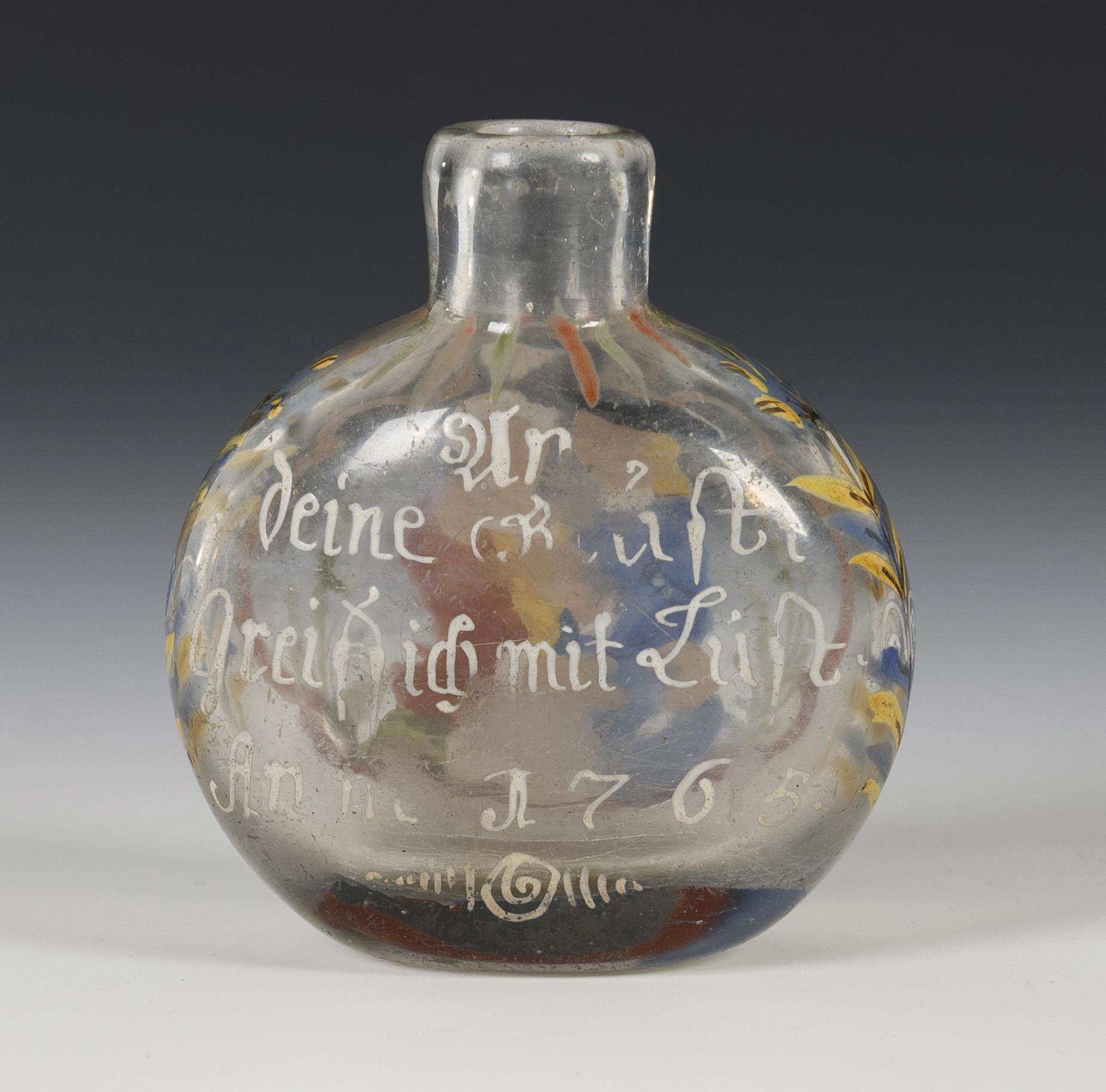 Kleine Plattflasche mit Zylinderhals; Abriss. Schauseitig die Darstellung eines sich umarmenden, barocken Paares, verso die Aufschrift "An deine Brust greif ich mit Lust. Anno 1765.". Partiell minimal berieben.