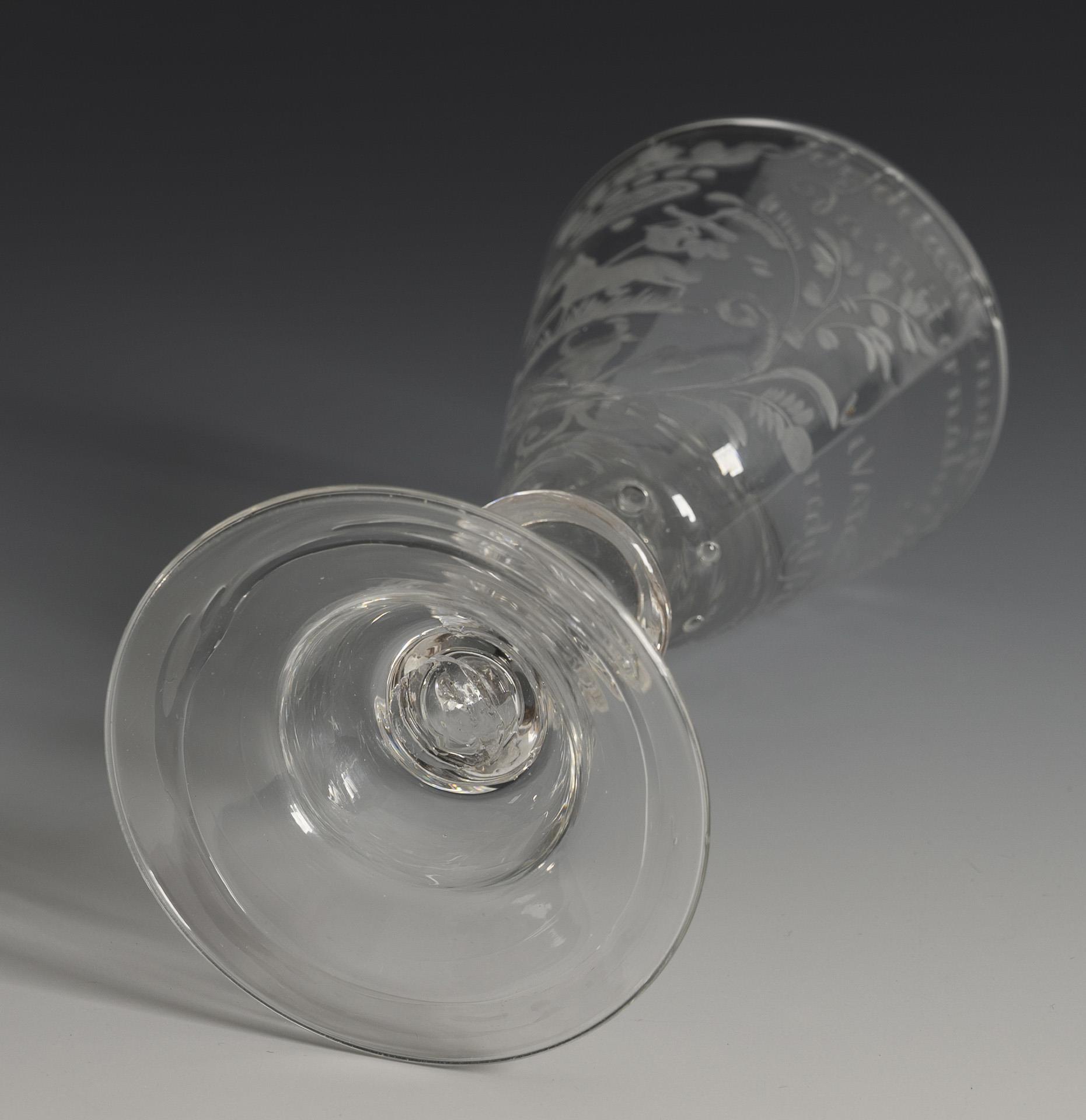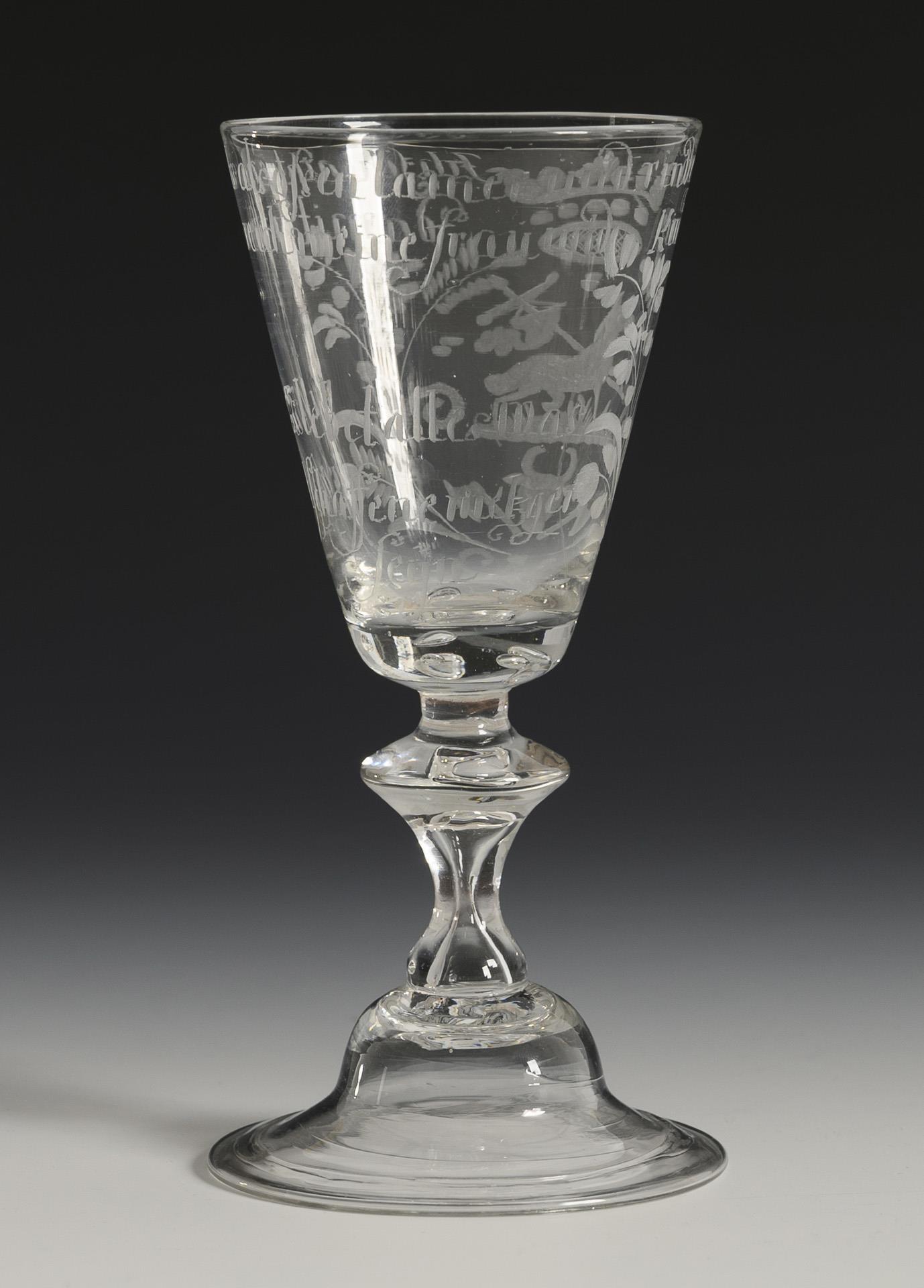 Konische Kuppa mit sieben eingestochenen Luftblasen im Boden, Balusterschaft mit eingestochener Luftblase, Hutfuß mit nach unten umgeschlagenem Rand; Abriss. Auf der Kuppa das schauseitig gravierte Metzgeremblem mit bekröntem Lamm, verso der Spruch "Ich schlachte nichts als ochsen lämmer und rinder, damit ernähre ich meine frau und Kinder / VIVAT Es lebet alles was rechtschaffene metzger seyn".