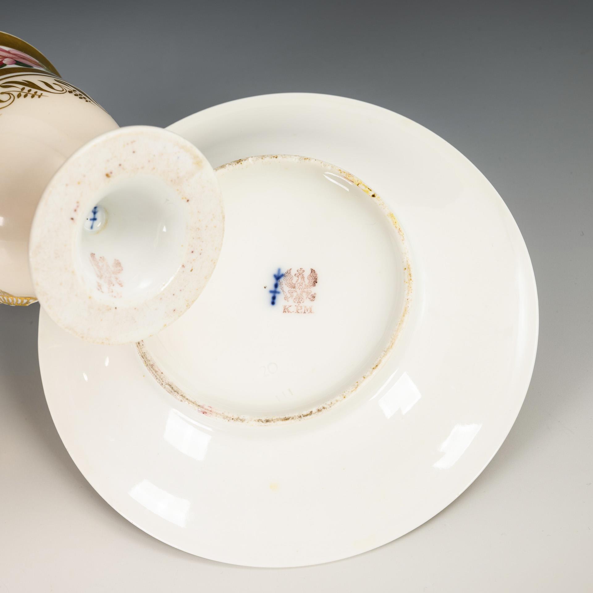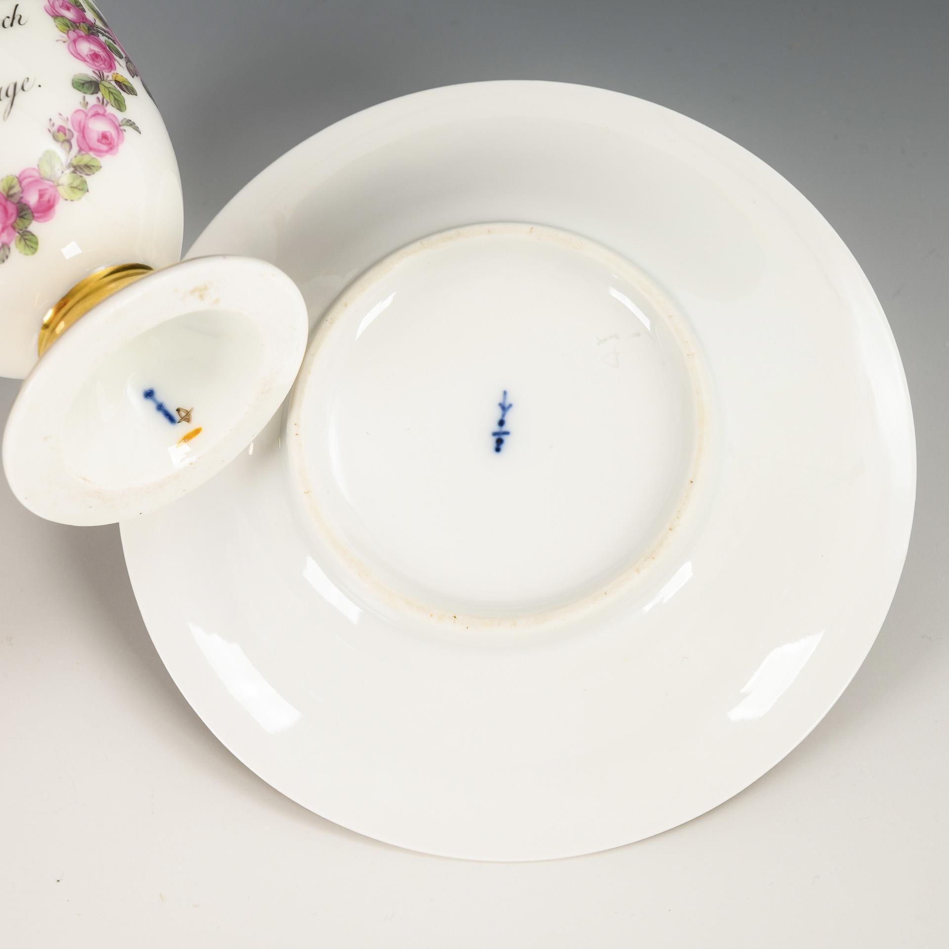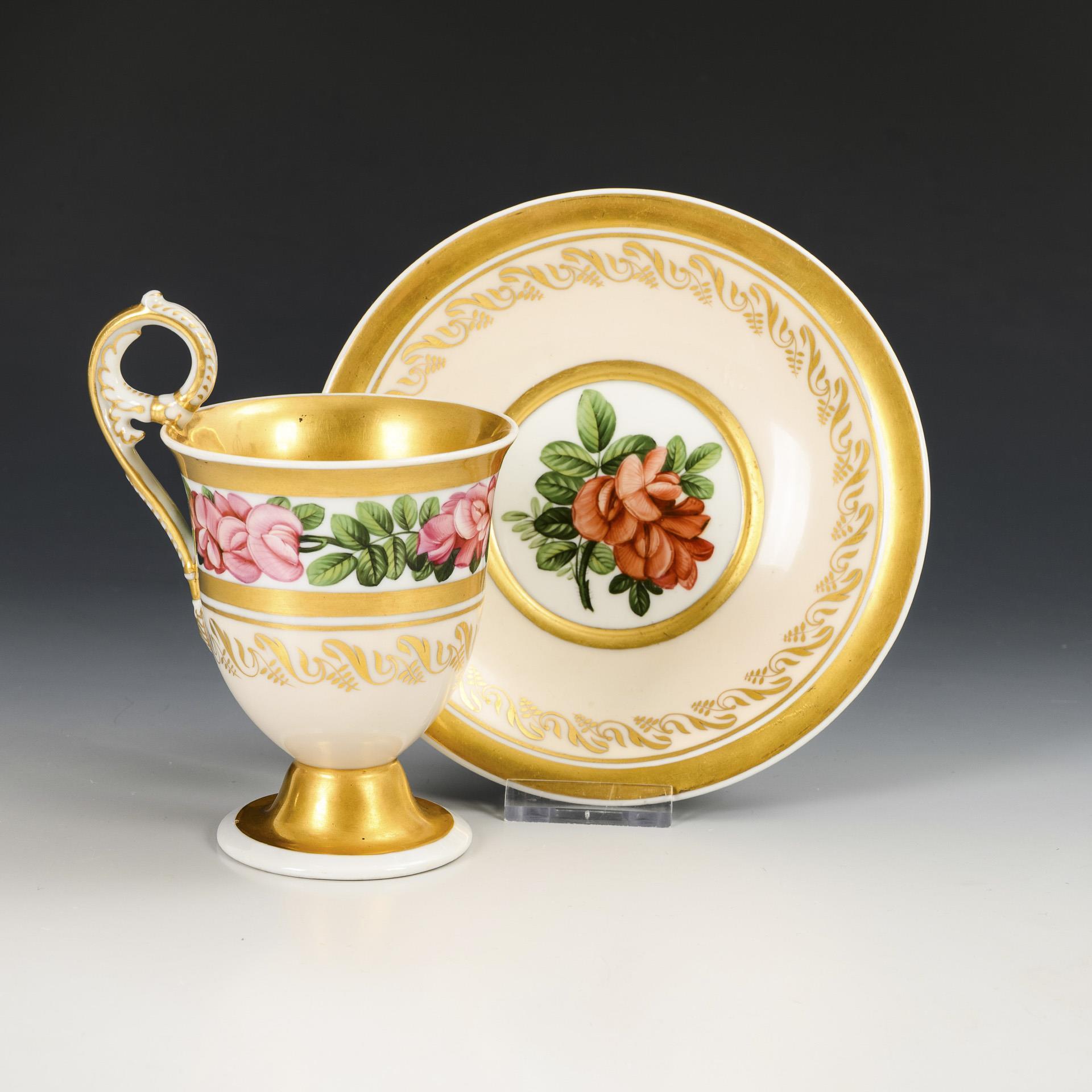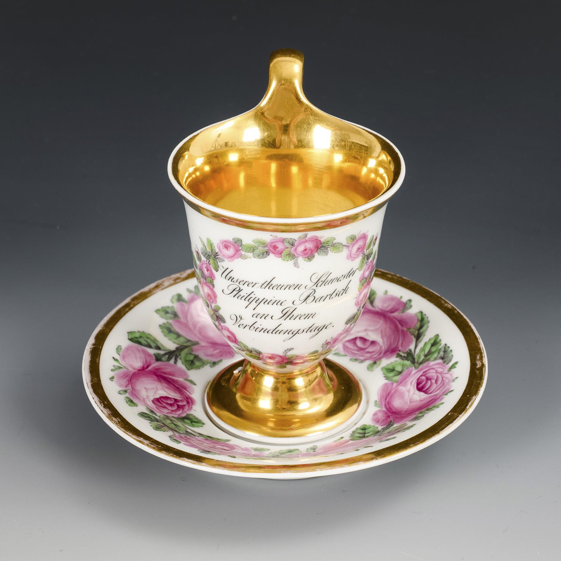1x Zeptermarke und rote Malermarke, 1817- ca. 1823: gefußte Glockentasse mit Campanerhenkel; schauseitig ein Rosenkranz mit der Widmung "Unserer theuren Schwester Philippine Bartsch an Ihrem Verbindungstage". / 1x Zeptermarke und rotbraune Adlermarke, ca. 1823-1832: gefußte Glockentasse mit Palmettenhenkel; bemalt mit einem Wickenband als Symbol der Hingabe und Treue, cremefarbener Teilfond mit einem vegetabilen goldenen Mäanderband. 1x Gold der Untertasse etwas berieben.