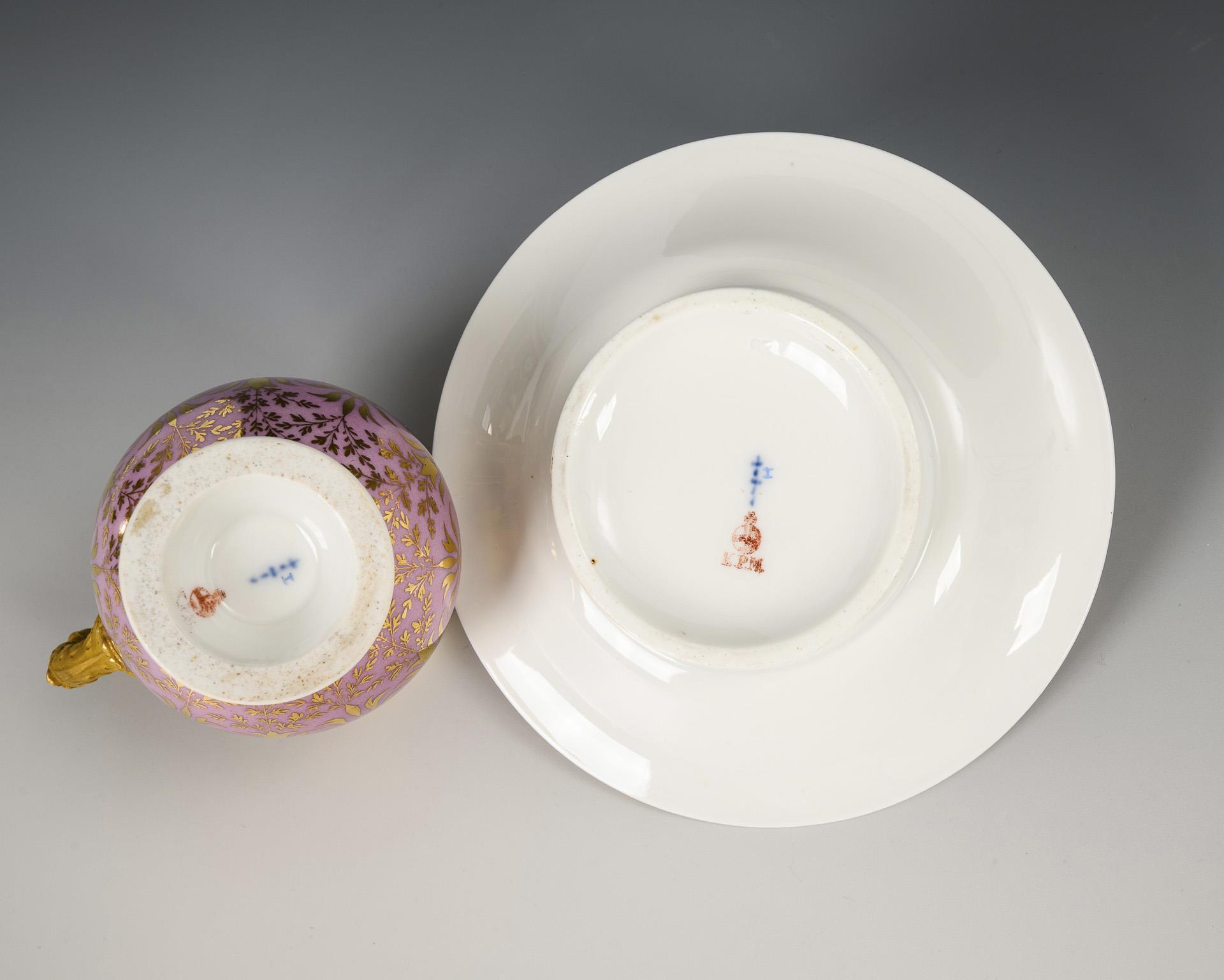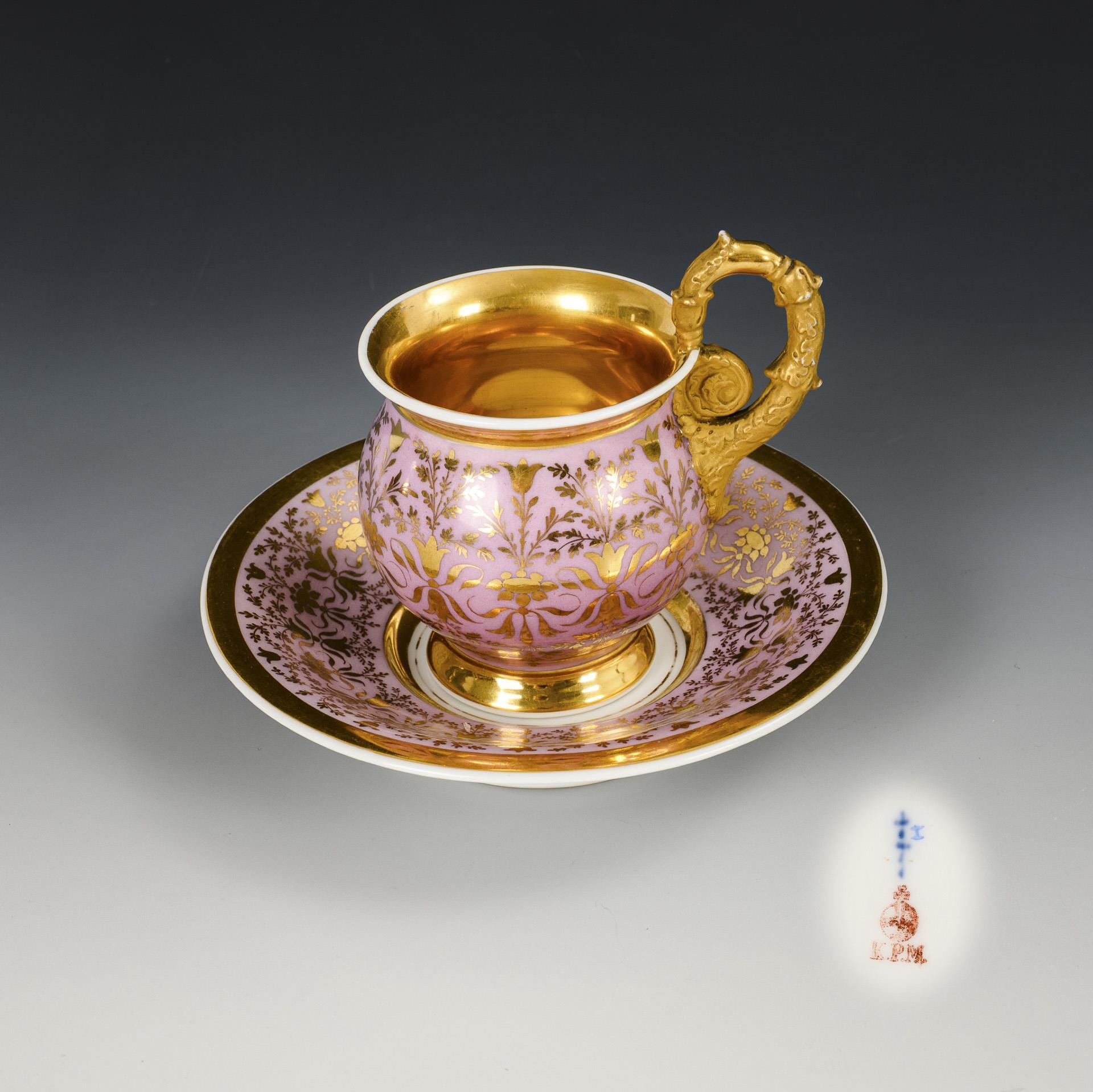 In Rosa und Gold staffiert. Tasse (H 10 cm), originale Untertasse (Ø 14,5 cm).