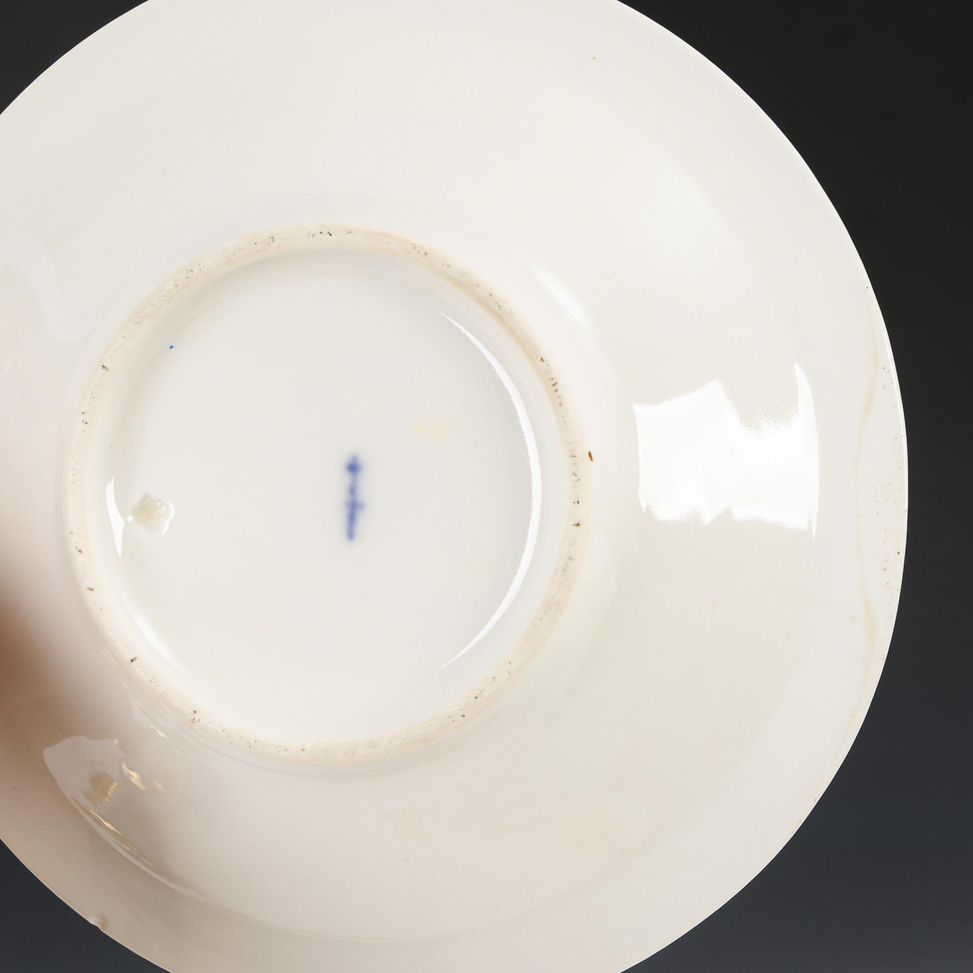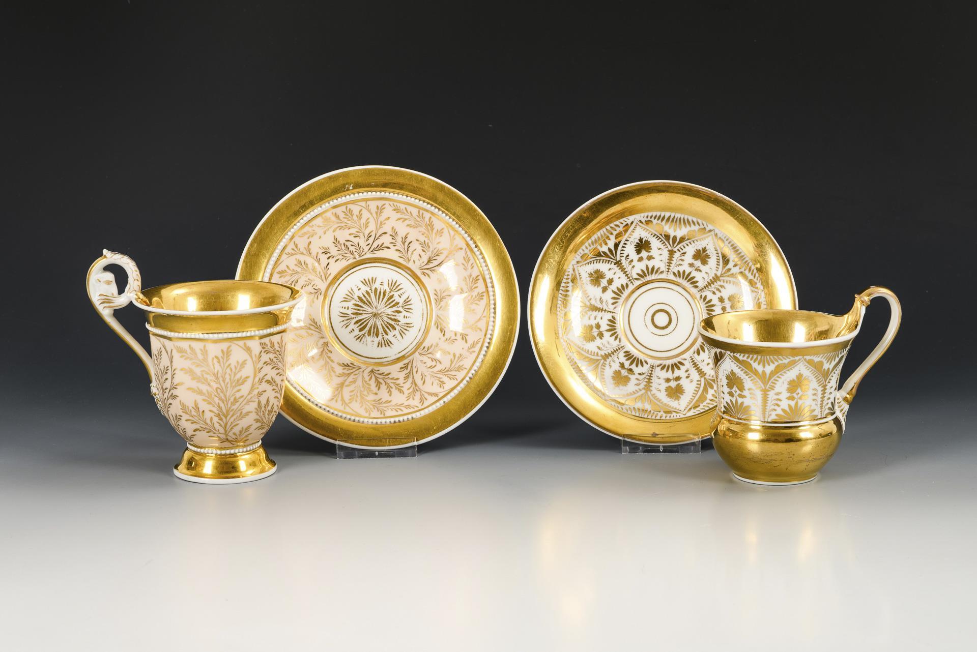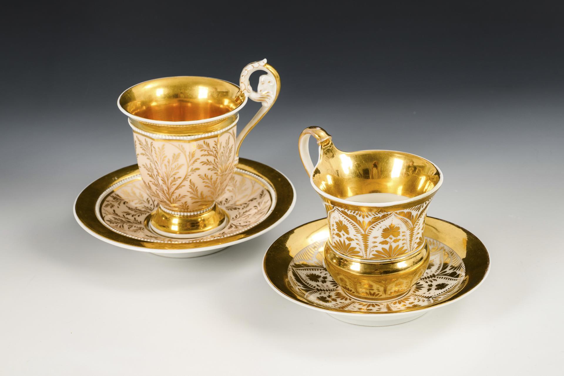 1x gefußte, polygonale Glockentasse mit Widderkopfhenkel und Perlbändern; hautfarbener Fond mit vegetabiler Goldmalerei, innen vergoldet. / 1x Kratertasse über bauchigem Stand, mit Palmettenhenkel; auf der Wandung goldene Floralmalerei und goldener Teilfond. 1 Untertasse mit unterseitiger Randbeschleifung und unterseitigem Randchip (Ø ca. 2 mm), 1 Tasse mit Randrestaurierung.