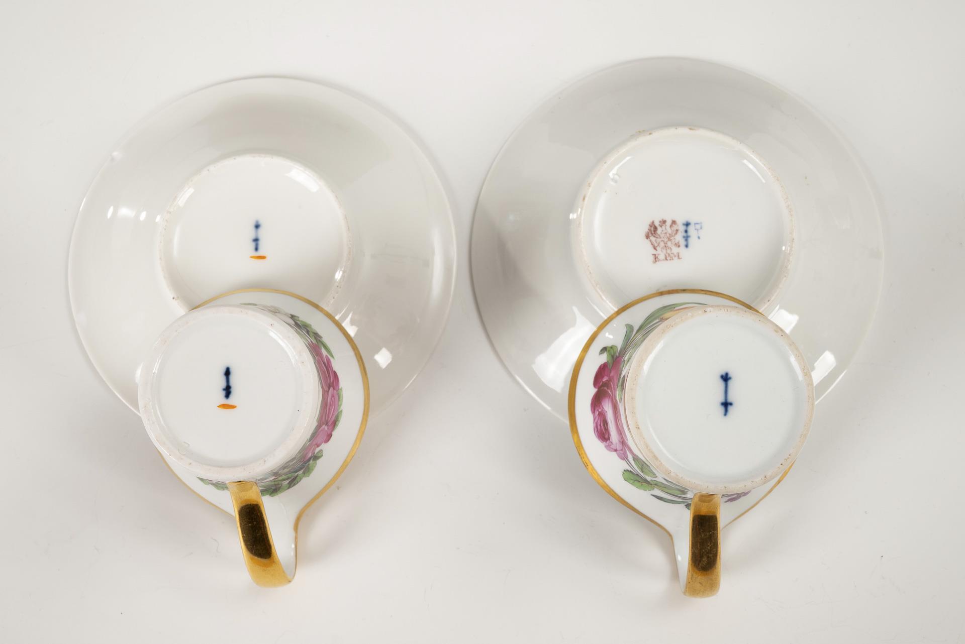 Polychrom bemalt, goldstaffiert. Tassen (H 9 und 8,5 cm), 1x ergänzte und 1x originale Untertasse (Ø 14,5 und 13,5 cm).