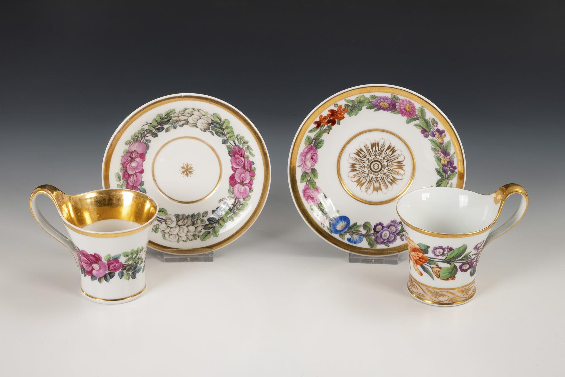 Modell "Konisch" mit Campanerhenkel. 1x Zeptermarke, Anfang 19. Jh.: auf der Wandung ein Blumenband mit Tulpe, Rose und Aurikeln, am Stand ein cremefarbenes Fondband mit goldenem Floralmäanderband. / 1x Zeptermarke und rote Malermarke, 1817-1823: auf der Wandung ein Band aus rosafarbenen und weißen Wicken, innen Teilvergoldung. 1 Untertasse mit zwei unterseitigen Chips.
