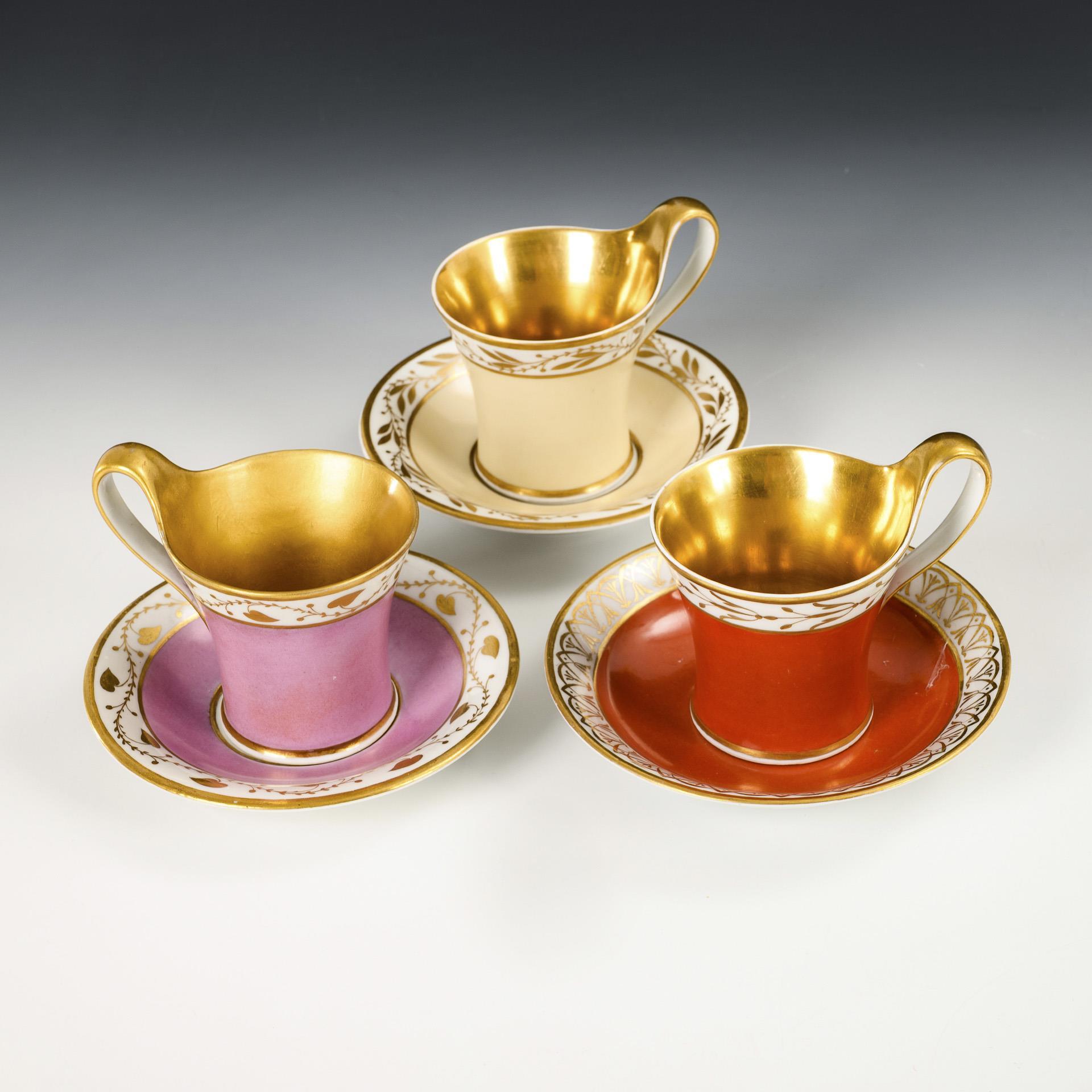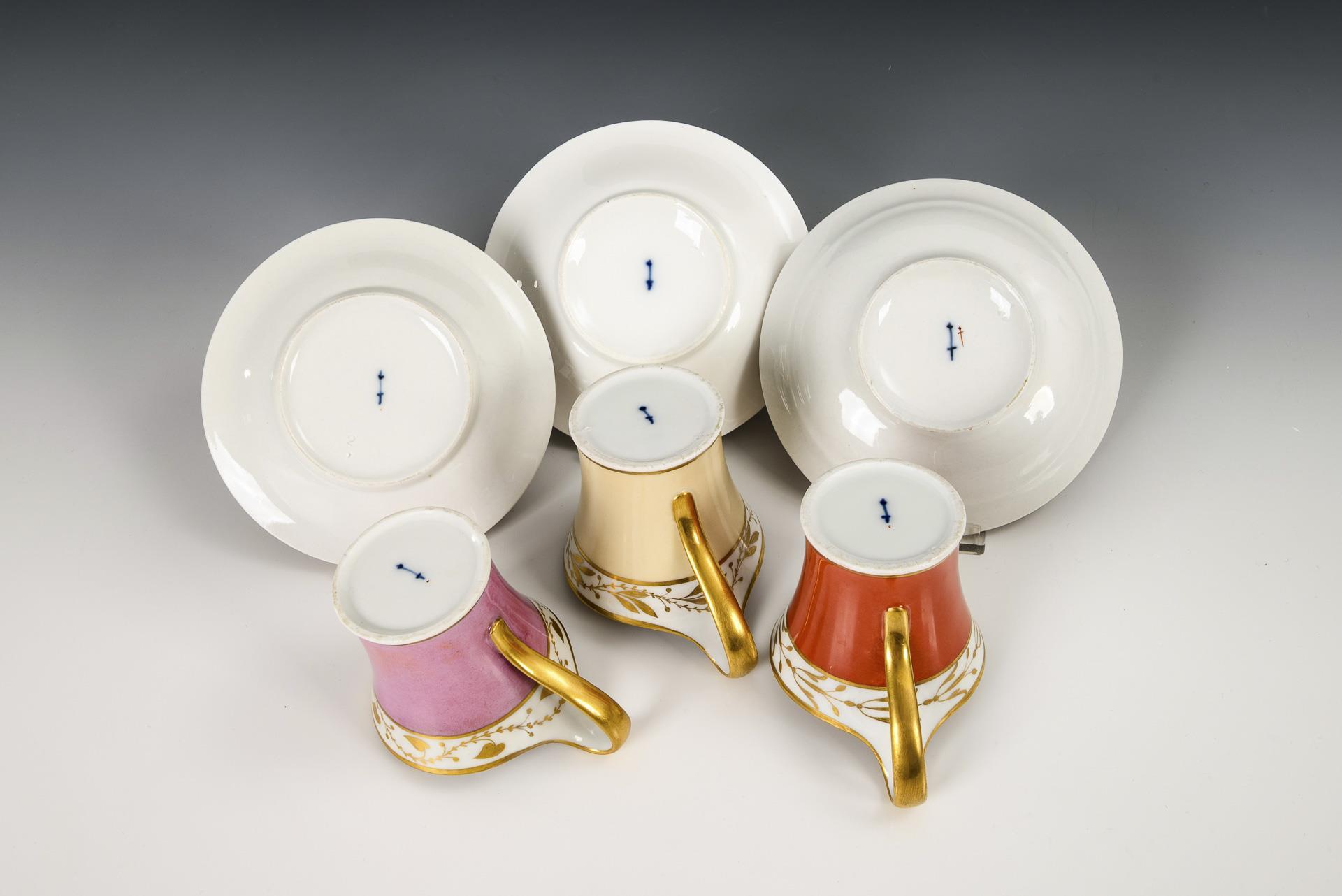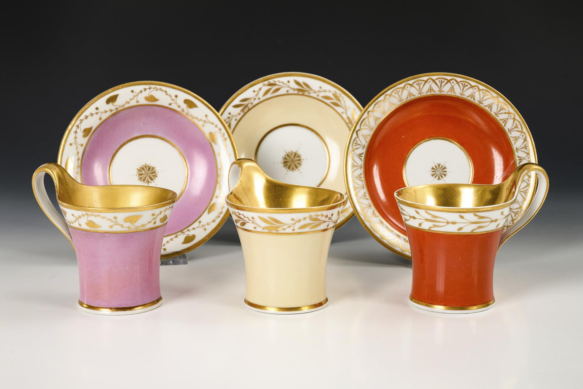 Polychrom bemalt, goldstaffiert. 3 Tassen (H 9 cm), 2 originale und 1 passend ergänzte Untertasse (Ø ca. 13,5 cm).