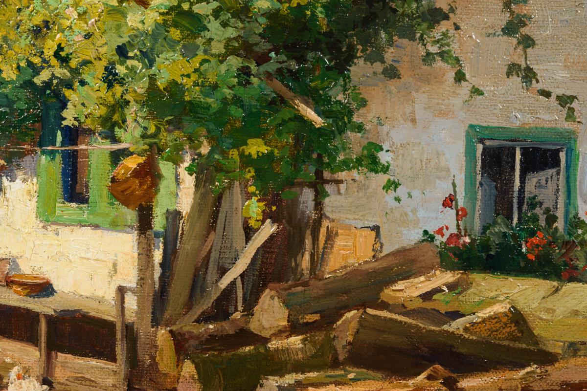 Helles Sonnenlicht über dem Hof mit den Baumstämmen.